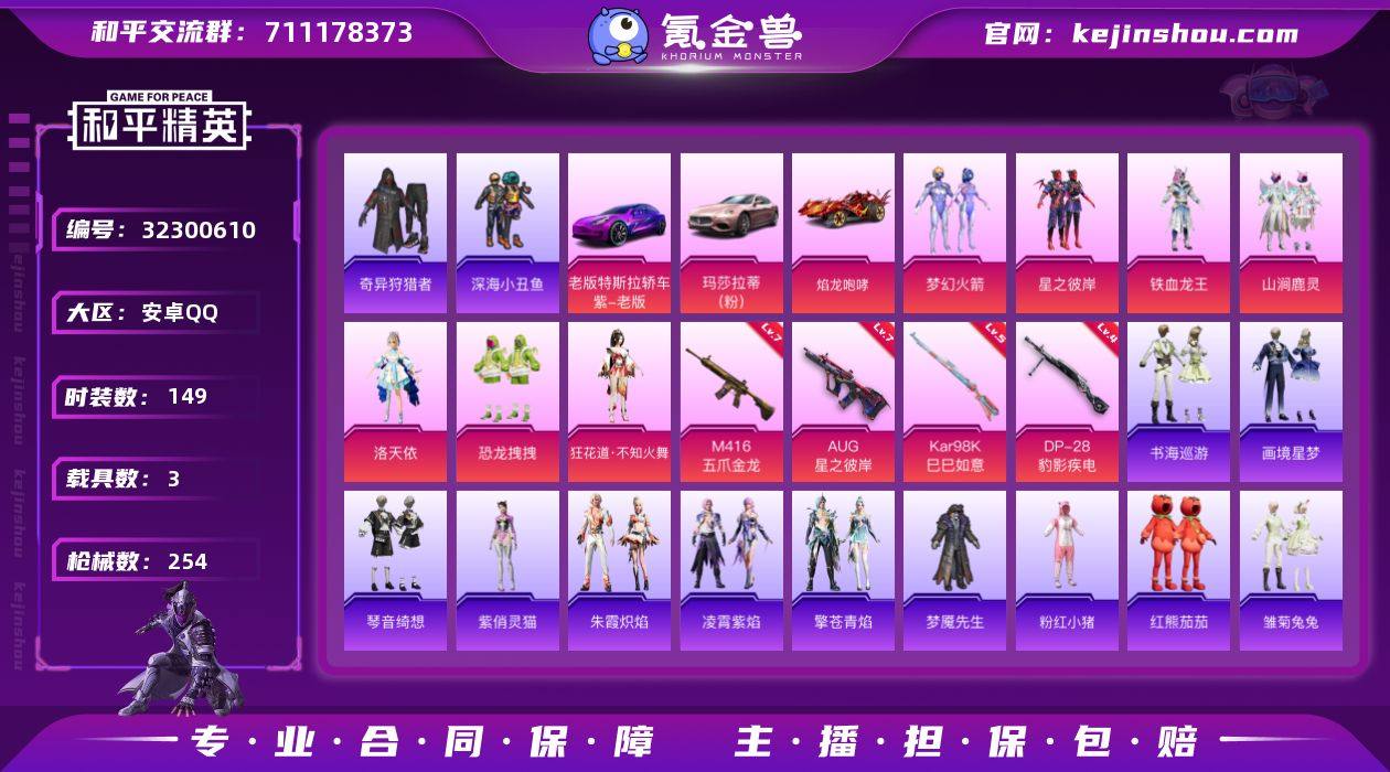 安卓 手Q-7粉装-11特效枪-2载具-1粉色飞行器-75713热力值-10王牌印记-164套装-234枪皮 【热门品类】:套装-都市猎人,套装-深海小丑鱼,角色-军刀雅典娜,套装-龟仙人,套装-暗影哥特,角色-Mark.06 【粉色套装】:粉装-铁血龙王,粉装-暗夜玫瑰,粉装-飒粉甜心,角色-阿尔茜,角色-智耀战神,角色-奇迹舞步 美琪,角色-奇迹舞步 美雪 【粉色枪皮等级】:AKM-绿萝繁花(五级),M16A4-垂柳戏鸭(四级),SCAR-L-机甲封神(五级),M416-五爪金龙(七级),GROZA-镜光银凌(五级),AUG-暖羊咩咩(五级),ARX-无垠阁(五级),Kar98K-巳巳如意(五级),Mk14-甜梦熊击(五级),M249-蓝莓炮弹(四级),DP-28-豹影疾电(五级) 【粉色载具】:兰博基尼Estoque(银翼灰),幻影随行 【粉色枪皮】:AKM-绿萝繁花,M16A4-垂柳戏鸭,SCAR-L-机甲封神,M416-五爪金龙,GROZA-镜光银凌,AUG-暖羊咩咩,ARX-无垠阁,Kar98K-巳巳如意,Mk14-甜梦熊击,M249-蓝莓炮弹,DP-28-豹影疾电 【粉色降落伞】:烈焰拳霸降落伞,暗夜玫瑰降落伞,洛神天依降落伞,庄周梦蝶降落伞,垂柳戏鸭降落伞,旋转彩虹降落伞,青空秋雨降落伞,第五大道降落伞,未来歌姬降落伞,炫光之旅降落伞,精灵梦叶罗丽降落伞,星穹咏叹调降落伞,荧海星豚降落伞,绯穹魔姬降落伞,炫彩糖果降落伞 【稀有套装】:套装-龟仙人,套装-绒宝小鹅,套装-巳巳如意,套装-雪国风尚,套装-炫彩糖果,套装-糖糖葫芦,套装-青团波波,角色-摩登魅猫,套装-燕燕于飞,套装-鱼渊荷华,套装-蓝海鲸歌,套装-朱霞炽焰,套装-凌霄紫焰 【稀有枪皮】:AKM-夜灯,AKM-影袭,AKM-缤纷海域,AKM-萌趣颜团子,AKM-虎虎生威,AKM-龙的传人,M16A4-幻世战舞者,M16A4-甜心亚梦,SCAR-L-玉兔迎春,SCAR-L-红色方程式,SCAR-L-金风玉露,M416-糯团青竹,M416-红色方程式,M416-蓝色火焰,GROZA-2B战斗服款...