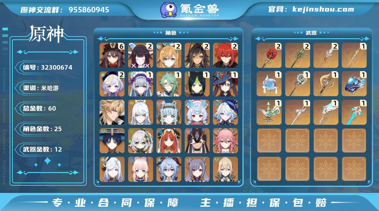 邮箱: 不送邮/死邮 总黄数: 60 冒险等级: 60 6命金色角色: 满命胡桃 2命金色角色: 二命迪卢克,二命七七,二命迪希雅,二命爱可菲,二命哥伦比娅 1命金色角色: 一命莫娜,一命提纳里,一命白术,一命梦见月瑞希 0命金色角色: 刻晴,琴,甘雨,珊瑚宫心海,申鹤,八重神子,赛诺,妮露,纳西妲,流浪者,芙宁娜,希格雯,伊涅芙,兹白,法尔伽 拥有武器: 天空之翼,和璞鸢,风鹰剑,天空之刃,天空之脊,护摩之杖,千夜浮梦,万世流涌大典,裁断,支离轮光 2精武器: 和璞鸢,天空之脊,护摩之杖 1精武器: 天空之翼,风鹰剑,天空之刃,千夜浮梦,万世流涌大典,裁断,支离轮光,帷间夜曲,朏魄含光