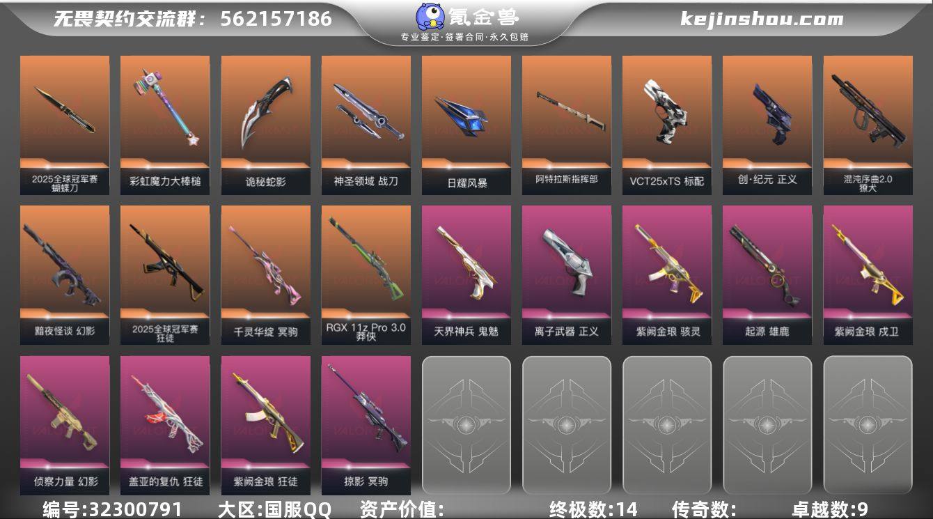 【套装】:2025全球冠军赛套装 【英雄】:幻棱,炼狱,维斯,暮蝶,钛狐,壹决,铁臂,捷风,雷兹,幽影,不死鸟,贤者,猎枭,蝰蛇,零,芮娜,奇乐,尚勃勒,霓虹,斯凯,夜露,星礈,K/O,海神,盖可,黑梦,钢锁 【近战武器】:近战武器-2025全球冠军赛 蝴蝶刀,近战武器-镭切,近战武器-彩虹魔力大棒槌,近战武器-诡秘蛇影 军刀,近战武器-神圣领域 战刀,近战武器-日耀风暴 遗器,近战武器-阿特拉斯指挥部 甩棍 【狂徒】:狂徒-2025全球冠军赛,狂徒-盖亚的复仇,狂徒-紫阙金琅,狂徒-诡秘蛇影 【幻影】:幻影-黯夜怪谈,幻影-侦察力量,幻影-神圣领域,幻影-末日之翼 【戍卫】:戍卫-紫阙金琅,戍卫-月球哨兵,戍卫-折光棱晶 【獠犬】:獠犬-混沌序曲//2.0,獠犬-神圣领域 【冥驹】:冥驹-千灵华绽,冥驹-掠影,冥驹-星云暗涌 【飞将】:飞将-末日之翼 【莽侠】:莽侠-RGX 11z Pro//3.0,莽侠-诡秘蛇影,莽侠-月球哨兵 【战神】:战神-神圣领域 【奥丁】:奥丁-神罚,奥丁-末日之翼 【判官】:判官-诡秘蛇影 【雄鹿】:雄鹿-起源,雄鹿-月球哨兵 【骇灵】:骇灵-紫阙金琅,骇灵-星云暗涌 【蜂刺】:蜂刺-星云暗涌,蜂刺-折光棱晶 【标配】:标配-折光棱晶 【VCT手枪】...