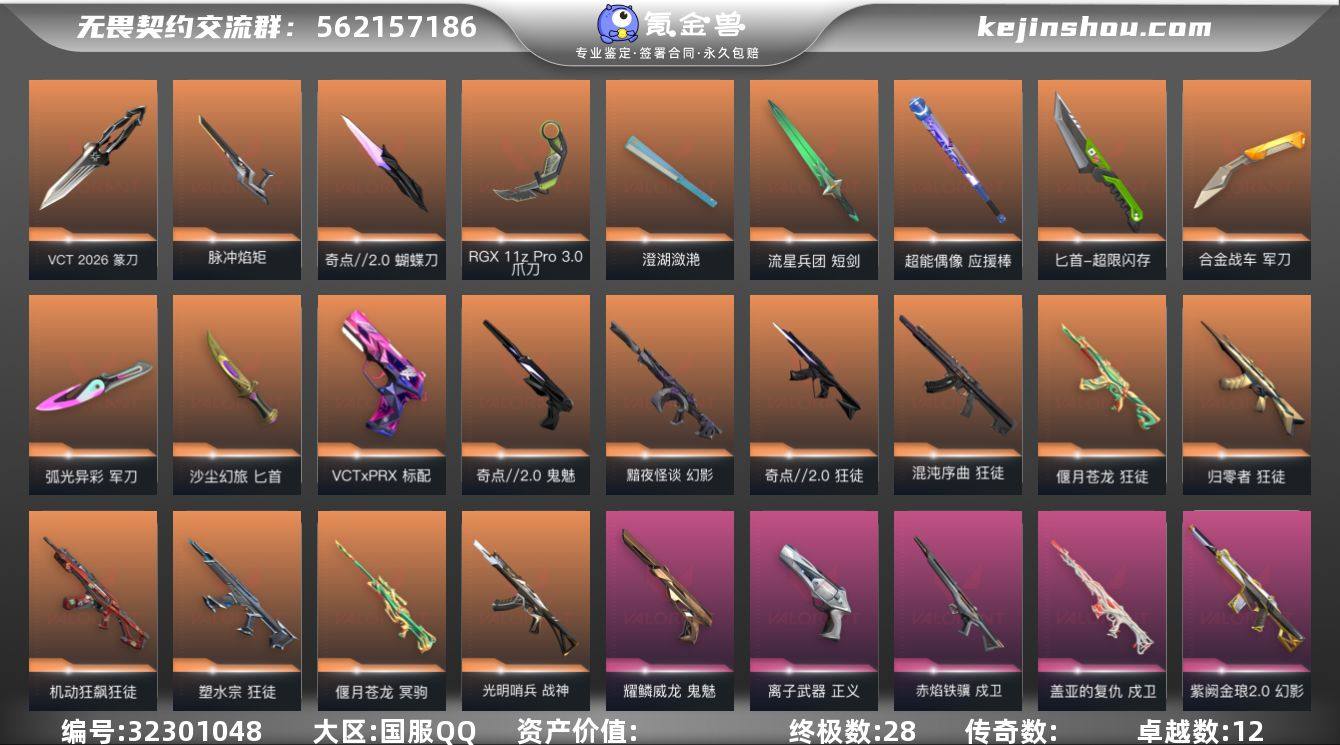 【套装】:VCT 2026 赛季套装,奇点//2.0套装,赤焰铁骥套装,耀鳞威龙套装 【英雄】:幻棱,炼狱,维斯,暮蝶,钛狐,壹决,铁臂,捷风,雷兹,幽影,不死鸟,贤者,猎枭,蝰蛇,零,芮娜,奇乐,尚勃勒,霓虹,斯凯,夜露,星礈,K/O,海神,盖可,黑梦,钢锁 【近战武器】:近战武器-VCT 2026 篆刀,近战武器-脉冲焰矩,近战武器-剥皮小刀,近战武器-奇点//2.0 蝴蝶刀,近战武器-RGX 11z Pro//3.0 爪刀,近战武器-威龙之刃,近战武器-澄湖潋滟,近战武器-流星兵团 短剑,近战武器-超能偶像 应援棒,近战武器-超限闪存 匕首,近战武器-合金战车 军刀,近战武器-弧光异彩 军刀,近战武器-魄月玄刃,近战武器-沙尘幻旅 匕首,近战武器-生物分子解离器 【狂徒】:狂徒-归零者,狂徒-混沌序曲,狂徒-机动狂飙,狂徒-奇点//2.0,狂徒-塑水宗,狂徒-偃月苍龙,狂徒-盖亚的复仇,狂徒-日冕雄师,狂徒-耀鳞威龙,狂徒-赤焰铁骥,狂徒-超能偶像,狂徒-弧光异彩,狂徒-流星兵团,狂徒-沙尘幻旅 【幻影】:幻影-黯夜怪谈,幻影-侦察力量,幻影-紫阙金琅//2.0,幻影-超限闪存,幻影-合金战车,幻影-噬源兽防卫工程,幻影-聚合之力 【戍卫】:戍卫-盖亚的复仇,戍卫-赤焰铁骥,戍卫-超能...