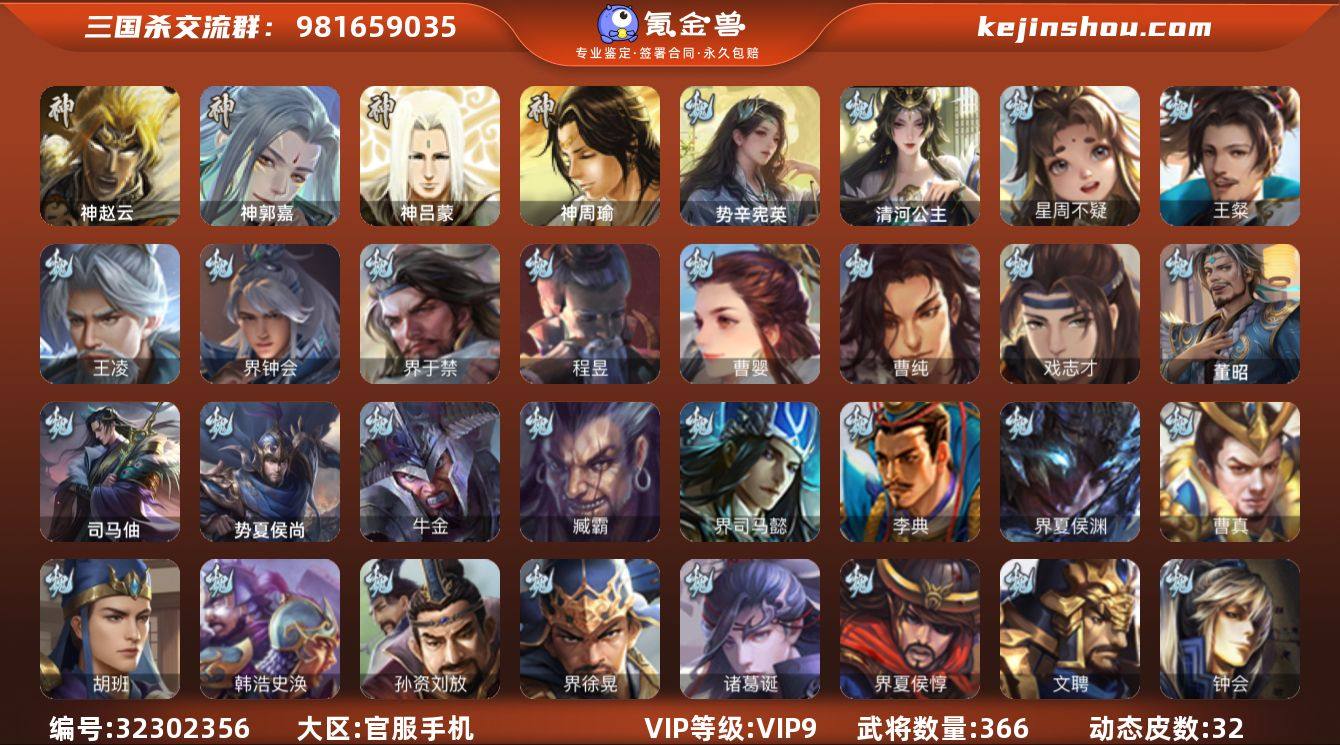 【14789535】官阶:大将军;VIP等级:VIP9;史诗武将数量:38;动态皮肤数量:32;武将总数:366;史诗宝珠数量:10;将魂数量:2500;神将:2;魏国史诗武将:20;蜀国史诗武将:7;吴国史诗武将:7;群史诗武将:11