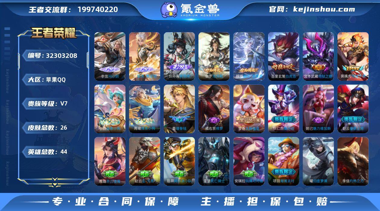 【高质量小号·问心剑·曜器灵螭龙剑·离恨烟·沧流箭·器灵落星盏·祥瑞亨通·白虎志·可二次】YXw18767-苹果Q-44英雄-26皮肤-0王者印记-0铭文-贵族积分2w【贵族7】【3无双·2珍品·3传说·3按键】【因赛季更新游戏段付以上号为准!】 【英雄全皮】:敖隐全皮 【无双皮肤】:李信问心剑,曜器灵螭龙剑,公孙离离恨烟 【珍品传说】:伽罗沧流箭,嫦娥器灵落星盏 【传说皮肤】:裴擒虎祥瑞亨通,百里玄策白虎志,宫本武藏地狱之眼 【限定皮肤】:公孙离离恨烟,暃埋骨钱,赵云皇家上将,狄仁杰魔术师,项羽海滩派对,百里玄策白虎志,梦奇天降福星 【年限皮肤】:百里玄策白虎志 【战令限定】:周瑜线条小狗,小乔线条小狗 【史诗皮肤】:周瑜线条小狗,小乔线条小狗,暃埋骨钱,梦奇天降福星,橘右京修罗,妲己魅力维加斯,狄仁杰魔术师,赵云皇家上将 【其他皮肤】:后羿阿尔法小队,亚瑟死亡骑士,安琪拉玩偶对对碰,赵云忍炎影,项羽海滩派对,暃碧珀绯影,曜归虚梦演,李信灼热之刃,铠龙域领主