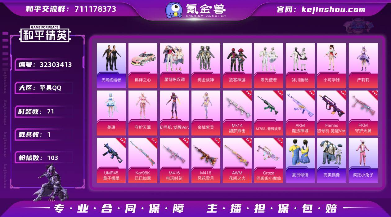 【连体号三螳螂天网11粉装11特效枪1载具带王者V91典藏2无双3珍品33传说可秒换绑不用等】 苹果Q区-37420热力值-71套装-103枪皮 【1载具】 羁绊之心【4稀有】 8号机 Mark.06 天网终结者【11粉装】 角色-初号机 觉醒Ver. 角色-美琪 角色-严莉莉 小可学妹 绚金战神 寒光使者 放客神游 冰川幽秘 角色-守护天翼 星穹咏叹调 角色-金域紫灵【11特效枪】 AWM-花间之火(4级) M416-风花雪月(5级) M416-电玩时刻(5级) UMP45-量子极限(5级) GROZA-巴啦啦小魔仙(6级) AKM-魔法神域(3级) M762-青锋波束(5级) Mk14-甜梦熊击(5级) Famas-初号机 觉醒Ver.(5级) PKM-守护天翼(3级) Kar98K-巳巳如意(5级)【5热门】 白色伏地魔 Mini14-梦幻火箭 Mark.06 8号机 MG3-幻世战舞者【2飞行器】 梦幻火箭飞行器 初号机 觉醒Ver.飞行器 营地ID:930934351