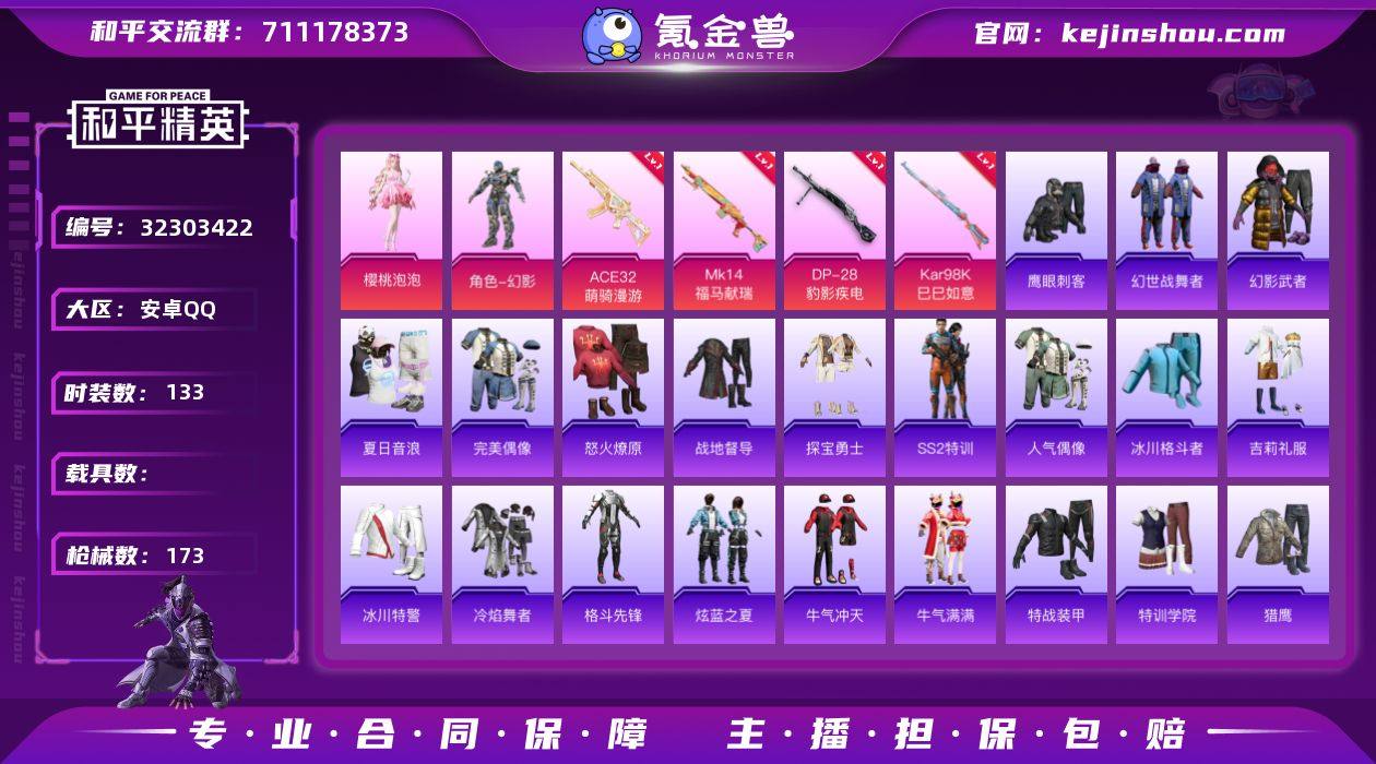 【kyhp726】安卓 手Q-1粉装-4特效枪-0载具-2粉色飞行器-22017热力值-1王牌印记-45套装-93枪皮 【热门品类】:套装-星河浪客 【粉色套装】:粉装-暗夜玫瑰 【粉色枪皮等级】:ACE32-萌骑漫游(二级),Kar98K-巳巳如意(五级),Mk14-福马献瑞(五级),DP-28-豹影疾电(五级) 【粉色枪皮】:ACE32-萌骑漫游,Kar98K-巳巳如意,Mk14-福马献瑞,DP-28-豹影疾电 【粉色飞行器】:炫彩糖果飞行器,桃源时光飞行器 【粉色降落伞】:绝对恒星降落伞,星之彼岸降落伞,环太平洋降落伞,荧海星豚降落伞,炫彩糖果降落伞 【稀有套装】:套装-巳巳如意,套装-炫彩糖果,套装-马上有钱,角色-绛羽幽主,套装-朱霞炽焰,套装-凌霄紫焰,角色-绯色魅影,套装-画境星梦,套装-琴音绮想,角色-曹焱兵 【稀有枪皮】:AKM-环太平洋,AKM-破晓战魂,M16A4-幻世战舞者,SCAR-L-夜灯,SCAR-L-炫彩节奏,SCAR-L-红色方程式,M416-红色方程式,M416-蓝色火焰,GROZA-影袭,AUG-耀粉歌者,QBZ-彩虹符号,AC-VAL-天降萌叽,蜜獾-绯穹魔姬,ACE32-画境星梦,ARX-凌霄紫焰,UZI-啾咪啾咪,UMP45-夜灯,UMP45-生命誓言,UMP45-蓝色火焰,汤姆逊-天降萌叽,汤姆逊-幻影战神,汤姆逊-环太平洋,MP5K-画境星梦,JS9-凌霄紫焰,P90-巳巳如意,Kar98K-幻影战神,Mini14-耀粉歌者,Mini14-绯穹魔姬,M1加兰德-画境星梦,S686-彩虹符号,S686-生命誓言,S686-巳巳如意,S1897-炫彩节奏,S12K-夜灯,AA12-G-画境星梦,M249-绯穹魔姬,MG3-幻世战舞者,MG-36-凌霄紫焰,P92-凌霄紫焰,突击盾牌-绝对恒星,大砍刀-鬼刀,平底锅-凌霄紫焰,平底锅-画境星梦,破片手榴弹-巳巳如意 【其他套装】:套装-完美偶像,套装-幻世保卫者,套装-旭日情侣,套装-森林游猎者,套装-海岛探路者,套装-竞技名士,套装-蓝色运动,套装-街头潮人,套装-青玉碎影,套装-魅力单车,...