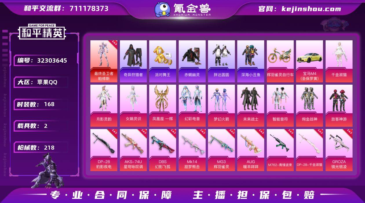 可二次实名【2级红装赤蝎金鞋小熊背包14特效枪11粉装2载具素材号 秒换绑不用等】 苹果Q区-74538热力值-8印记-168套装-218枪皮 【1红装】 最终圣卫者-帕修斯(2级)【2载具】 宝马M4(圣保罗黄) 辉羽雀灵自行车【5稀有】 赤蝎幽灵 派对舞王(金靴子) 派对舞王 萌熊伴侣背包(小熊背包) 奇异狩猎者【11粉装】 梦幻火箭 绚金战神 放客神游 智能音符 未来战士 角色-凤凰座 一辉 角色-月影灵韵 角色-女娲灵识 幻影飞狐 幻彩电音 角色-千金淑猫【14特效枪】 M416-女娲灵识(3级) MG3-辉羽雀灵(3级) AKM-炫紫旋律(6级) UMP45-恐龙拽拽(7级) M762-青锋波束(5级) DP-28-千金淑猫(5级) SVD-月影灵韵(5级) Kar98K-巳巳如意(5级) AKS-74U-星穹咏叹调(2级) Mk14-甜梦熊击(5级) AUG-暖羊咩咩(5级) GROZA-镜光银凌(5级) DP-28-豹影疾电(5级) DBS-幻影飞狐(5级)【230热门】 浪漫天命 鹰眼刺客 破蛋小黄鸡 激萌罗小黑 小丑鱼 迅捷狂鲨 深海小丑鱼 浪漫波比 胖达圆圆 英勇保护者 暗影哥特(红眼罩) 团圆交子 瑞龙福将 狂沙舞者 白色伏地魔 SS25特训 SS24特训 SS22特训 Mini14-梦幻火箭 M24-未来战士 AKM-环太平洋 SCAR-L-玉兔迎春 M762-天降萌叽 Mk47-乌木金纹 UZI-娇憨猪猪 UMP45-蓝色火焰 DBS-彩...