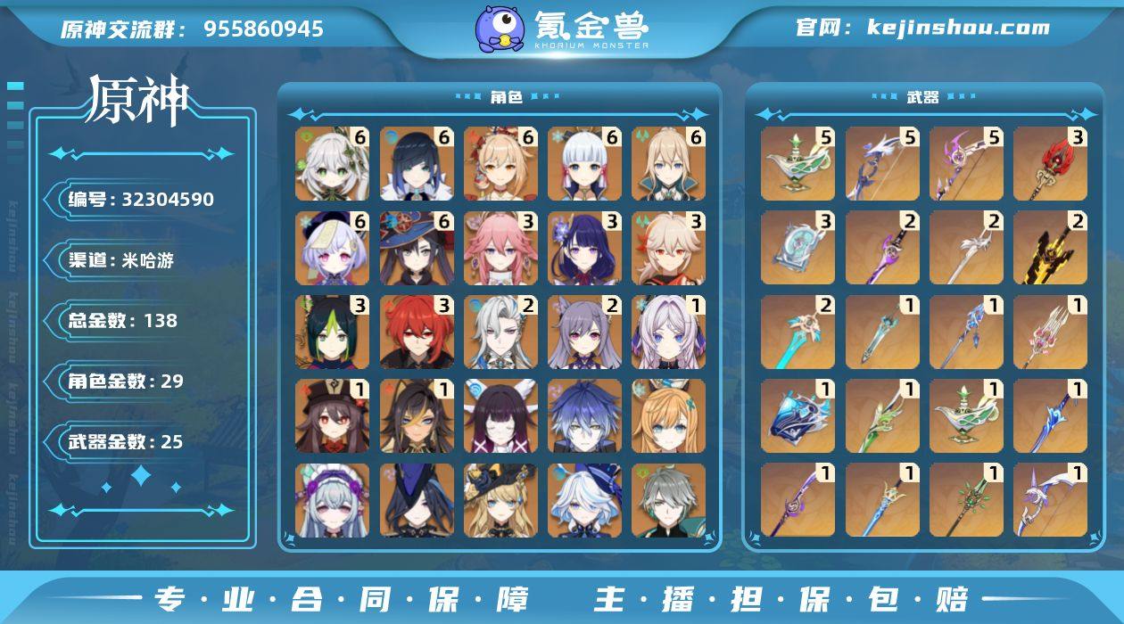 邮箱: 未绑定 总黄数: 138 冒险等级: 60 6命金色角色: 满命神里绫华,满命宵宫,满命七七,满命莫娜,满命琴,满命夜兰,满命纳西妲 3命金色角色: 三命迪卢克,三命枫原万叶,三命雷电将军,三命八重神子,三命提纳里 2命金色角色: 二命刻晴,二命那维莱特 1命金色角色: 一命胡桃,一命迪希雅,一命茜特菈莉 0命金色角色: 优菈,钟离,阿贝多,神里绫人,艾尔海森,芙宁娜,娜维娅,克洛琳德,梦见月瑞希,爱可菲,菲林斯,哥伦比娅 拥有武器: 狼的末路,雾切之回光,飞雷之弦振,四风原典,和璞鸢,阿莫斯之弓,天空之傲,风鹰剑,天空之刃,无工之剑,斫峰之刃,天空之脊,护摩之杖,薙草之稻光,苍古自由之誓,波乱月白经津,若水,千夜浮梦,裁叶萃光,万世流涌大典,香韵奏者,血染荒城,狼的武功歌 5精武器: 飞雷之弦振,若水,千夜浮梦 3精武器: 四风原典,护摩之杖 2精武器: 雾切之回光,风鹰剑,天空之刃,无工之剑 1精武器: 狼的末路,和璞鸢,阿莫斯之弓,天空之傲,斫峰之刃,天空之脊,薙草之稻光,苍古自由之誓,波乱月白经津,千夜浮梦,裁叶萃光,万世流涌大典,香韵奏者,血染荒城,狼的武功歌