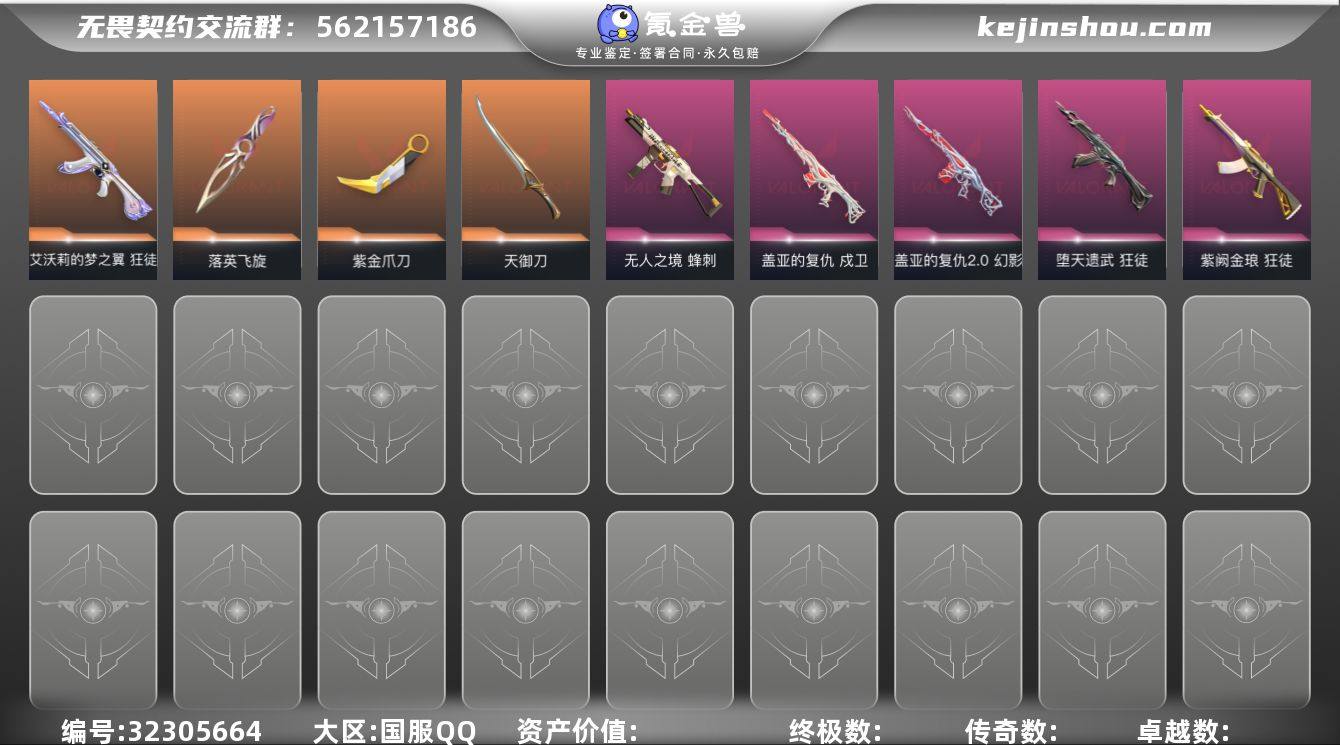 【套装】:离子武器//2.0套装,神中神罚套装 【英雄】:幻棱,炼狱,维斯,暮蝶,钛狐,壹决,捷风,雷兹,不死鸟,贤者,猎枭,蝰蛇,零,芮娜,奇乐,斯凯,夜露,K/O,盖可,黑梦,钢锁 【近战武器】:近战武器-神之刃,近战武器-紫金爪刀,近战武器-落英飞旋,近战武器-离子武器//2.0 爪刀,近战武器-天御刀,近战武器-诡秘蛇影 军刀,近战武器-日耀风暴 遗器,近战武器-阿特拉斯指挥部 甩棍 【狂徒】:狂徒-艾沃莉的梦之翼,狂徒-归零者,狂徒-混沌序曲,狂徒-塑水宗,狂徒-堕天遗武,狂徒-紫阙金琅,狂徒-离子武器//2.0,狂徒-诡秘蛇影 【幻影】:幻影-黯夜怪谈,幻影-盖亚的复仇//2.0,幻影-神中神罚,幻影-末日之翼 【戍卫】:戍卫-盖亚的复仇,戍卫-折光棱晶 【獠犬】:獠犬-星航勇进 【冥驹】:冥驹-虎魄春明 【飞将】:飞将-末日之翼 【莽侠】:莽侠-神中神罚,莽侠-诡秘蛇影 【战神】:战神-离子武器//2.0 【奥丁】:奥丁-末日之翼 【判官】:判官-诡秘蛇影 【骇灵】:骇灵-离子武器//2.0,骇灵-神中神罚 【蜂刺】:蜂刺-无人之境,蜂刺-折光棱晶 【标配】:标配-源能者危机001,标配-折光棱晶 【VCT手枪】:标配-VCT25 x LEV 【正义】:正义-掠影 【鬼魅】:鬼魅...