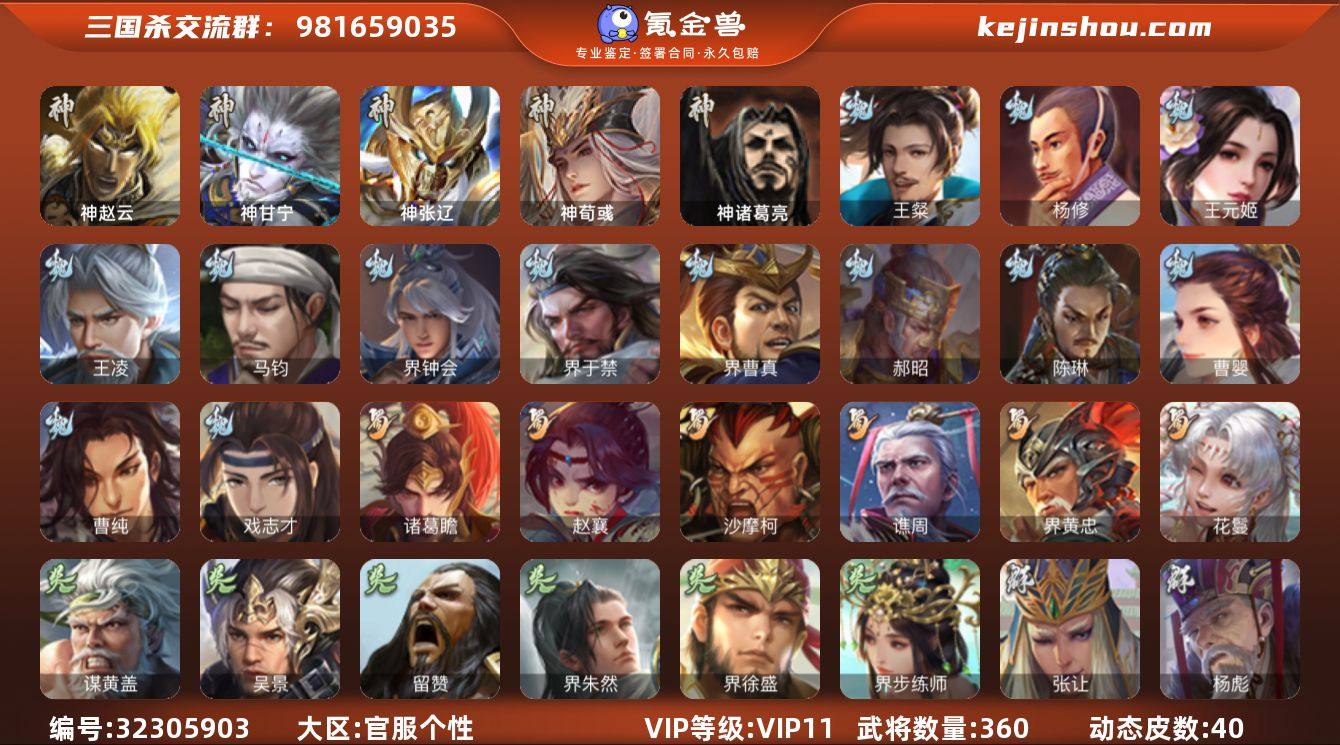 官阶:大将军;VIP等级:VIP11;史诗武将数量:47;动态皮肤数量:28;武将总数:396;史诗宝珠数量:13;将魂数量:1062;神将:7;魏国史诗武将:12;蜀国史诗武将:11;吴国史诗武将:6;群史诗武将:14 神吕布,神赵云,神司马懿,神张辽,神孙策,神荀彧,神诸葛亮,王粲,杨修,王元姬,界钟会,界于禁,嵇康,郝昭,陈琳,曹纯,戏志才,程昱,关索,马云騄,谋赵云,谋马超,诸葛瞻,赵襄,张星彩,沙摩柯,界黄忠,花鬘,董允,谋黄盖,界徐盛,贺齐,势陆郁生,谋孙尚香,左慈,张让,杨彪,审配,麹义,南华老仙,沮授,界左慈,界李儒,公孙康,卑弥呼,许攸,兀突骨,士燮,神吕蒙,神周瑜,神关羽,SP关羽,SP曹仁,SP蔡文姬,乐进,曹昂,诸葛诞,朱灵,文聘,SP姜维,张春华,钟会,曹冲,郭淮,满宠,界王异,界曹操,界司马懿,界夏侯惇,界张辽,界许褚,界郭嘉,李典,曹真,韩浩史涣,陈群,曹叡,曹休,钟繇,司马朗,王基,李通,郭皇后,孙资刘放,辛宪英,界甄姬,吕虔,鲁芝,蒯越蒯良,界典韦,界荀彧,界徐晃,杜畿,界曹丕,毌丘俭,界邓艾,张恭,界曹植,界满宠,界郭淮,卞夫人,界陈群,华歆,蔡贞姬,袁涣,王双,崔琰,阮慧,谋徐晃,谋于禁,界曹休,谋夏侯渊,牛金,界夏侯渊,界曹仁,臧霸,唐咨,董昭,SP孙尚香,关银屏,夏侯霸,马良,关兴张苞,廖化,界马岱,关平,简雍,刘封,界法正,界关兴张苞,界刘备,界关羽,界张飞,界赵云,界马超,SP徐庶,吴懿,周仓,张松,刘谌,夏侯氏,糜竺,马忠,孙乾,李严,黄皓,吴苋,秦宓,界黄月英,界诸葛亮,赵统赵广,严颜,界伊籍,界卧龙诸葛,界庞统,界孟获,界祝融,陈到,界姜维,界刘禅,胡金定,张翼,杨仪,界廖化,邓芝,界简雍,费祎,糜夫人,王甫赵累,界周仓,宗预,蒋琬,刘巴,彭羕,谋庞统,界张嶷,谋张飞,吴班,诸葛果,界魏延,蒋琬费祎,糜芳傅士仁,甘夫人,鲁肃,孙茹,凌操,大乔小乔,诸葛恪,诸葛瑾,孙鲁育,程普,韩当,潘璋马忠,虞翻,朱然,界周泰,界甘宁,界吕蒙,界黄盖,界周瑜,界大乔,界陆逊,孙鲁班,朱桓,顾雍...