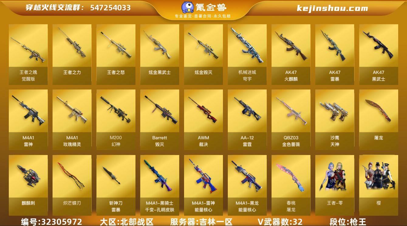 吉林一区-35V-3王者武器数-2炫金武器数 【热门武器】:QBZ03-金色蔷薇,M200-幻神,USP-雷暴,炽芒蝶刃 【王者炫金武器】:王者之怒,王者之力,炫金武士,炫金毁灭 【音效卡】:M4A1-雷神音效卡,Barrett-毁灭音效卡 【皮肤】:雷神-能量核心,M4A1-千变-孔明皮肤,黑龙-能量核心,屠龙-春桃 皮肤 【角色】:樱,王者-零,修道士,暗夜-X,芳心审判者,灵狐-花神,龙儿,玫瑰花神,蛇姬 【人偶武器】:M4A1-雷神-精英刀锋 【挑战大师】:神圣爆裂者III,AK47-冰龙粉碎者,阐释者III 【英雄级武器】:AK47-火麒麟,M4A1-雷神,AK47-黑武士,AK47-雷暴,M4A1-玫瑰精灵,QBZ03-金色蔷薇,王者之魄-觉醒版,机械迷城-穹宇,Barrett-毁灭,AWM-裁决,M200-幻神,AA-12-雷霆,沙鹰-天神,USP-雷暴,屠龙,麒麟刺,炽芒蝶刃,斩神刀-雷暴,高爆手雷-雷暴*5,闪光弹-雷暴*5,烟雾弹-雷暴*5 【源级武器】:源-千变,源·火麒麟*2,源·雷神*3,魂·M4A1-雷神-化蛇,御·雷神-小白龙,御·黑骑士·哪吒闹海,灵·黑骑士-破界 I,魂·黑武士-锋芒破茧,源·武圣,源·机械迷城,魂·HK417-朱雀-凤灵*2,源-金色蔷薇,魂·QBZ03-金色蔷薇-蛇姬,魂·9A91·烈火-电子连击,魂·玫瑰精灵-傲梅,源·天龙,魂...