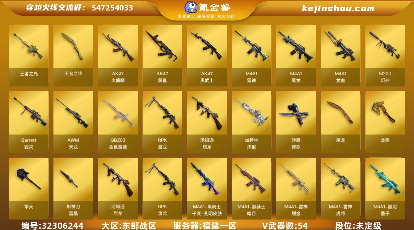 福建一区-57V-6王者-1炫金 【热门武器】:QBZ03-金色蔷薇,M4A1-青龙,M200-幻神,Kar98K-星神,汤姆逊-烈龙*6,RPK-盘龙*6,加特林-炼狱*2,斯泰尔-蝴蝶,沙鹰-修罗 【王者炫金武器】:王者之光,王者之锋,炫金骑士 【音效卡】:M4A1-雷神音效卡,Barrett-毁灭音效卡,死神-雪域霜狐-怀旧音效卡 【皮肤】:雷神-虎将,雷神-耀金皮肤,火麒麟-华夏之心,火麒麟-心动糖果,毁灭耀金皮肤,M4A1-千变-孔明皮肤,黑龙-墨子皮肤,黑骑士-暗月,AK47-黑武士-361,修罗-星空 【角色】:葵,炫,战地猎狐,王者春,雪域霜狐,风暴女,嘉年华灵狐,娟娟,灵狐者-黄金海岸,萌儿,蛇姬,铁骑荣耀,兔囡囡 【人偶武器】:迷你救赎猎手,斯泰尔-蝴蝶,AWM-灵狐-15周年嘉年华,海滩汪汪-巴雷特,迷你生化手雷 【英雄级武器】:AK47-火麒麟,M4A1-黑龙*2,M4A1-雷神,AK47-黑武士*2,AK47-黑鲨*2,M4A1-龙血*2,M4A1-青龙,死神-雪域霜狐,QBZ03-金色蔷薇,AWM-天龙,Barrett-毁灭*2,M200-幻神,Kar98K-星神,RPK-盘龙*6,加特林-炼狱*2,汤姆逊-烈龙*6,沙鹰-修罗,屠龙*4,龙啸*4,擎天*3,斩神刀-雷暴,王者之锋-觉醒版*2,高爆手雷-雷暴*3,闪光弹-雷暴*3,烟雾弹-雷暴*3 【道具】:XR...