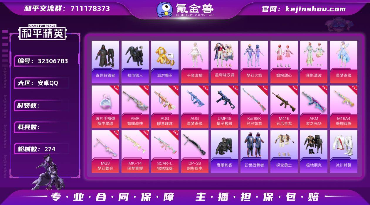 金鞋 满级星梦奇缘AUG】c27484-【无二次】【因赛季更新游戏段付以上号为准!】 安卓Q-5稀有6粉装17特效枪11热门169套装274枪皮 8w热力值 15印记 历史卓越王牌13星 【5稀有】 奇异狩猎者 都市猎人 浪漫天命 派对舞王 派对舞王(金靴子) 【6粉装】 梦幻火箭 千金淑猫 星穹咏叹调 星梦奇缘 飒粉甜心 莲影清波 【17特效枪】 M416-五爪金龙 (7级) SCAR-L-锦绣绵绵 (5级) AKS-74U-森灵之息 (5级) Kar98K-巳巳如意 (5级) DP-28-豹影疾电 (5级) AUG-暖羊咩咩 (5级) AUG-星梦奇缘 (9级) UMP45-量子极限 (5级) Mk14-闲梦青缨 (5级) AMR-智耀战神 (5级) MG3-梦幻舞会 (5级) AKM-梦之光华 (7级) M16A4-垂柳戏鸭 (4级) AKS-74U-森灵之息 (5级) Mk14-福马献瑞 (5级) AA12-G-萌骑幻想 (1级) 破片手榴弹-瓶中星球 (5级) 【11热门】 Mark.06 小丑鱼 龟仙人 2B战斗服款 鹰眼刺客 暗影哥特 团圆交子 狂沙舞者 漫步者 破蛋小黄鸡 S686-奇异狩猎者 【3飞行器】 梦幻火箭飞行器 繁龙极客飞行器 天之羽翼飞行器 【2头盔】 梦幻火箭头盔 深海小丑鱼头盔 【2背包】 梦幻火箭背包 深海小丑鱼背包