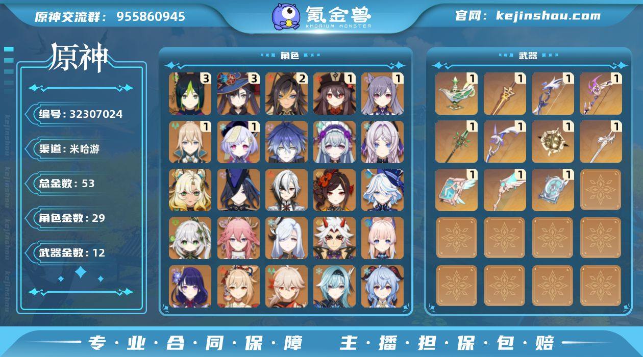 【YSYT1035】60级/53黄/女主/29个五星角色/12个五星武器/千织/希诺宁/菲林斯/达达利亚/阿蕾奇诺/荒泷一斗/钟离/梦见月瑞希/枫原万叶/茜特菈莉/甘雨/克洛琳德/八重神子/纳西妲/三命提纳里/芙宁娜/宵宫/一命胡桃/迪卢克/雷电将军/一命刻晴/珊瑚宫心海/申鹤/一命琴/二命迪希雅/一命七七/三命莫娜/优菈/埃洛伊/飞雷之弦振/阿莫斯之弓/天空之翼/千夜浮梦/尘世之锁/和璞鸢/圣显之钥/风鹰剑/若水/四风原典/天空之卷