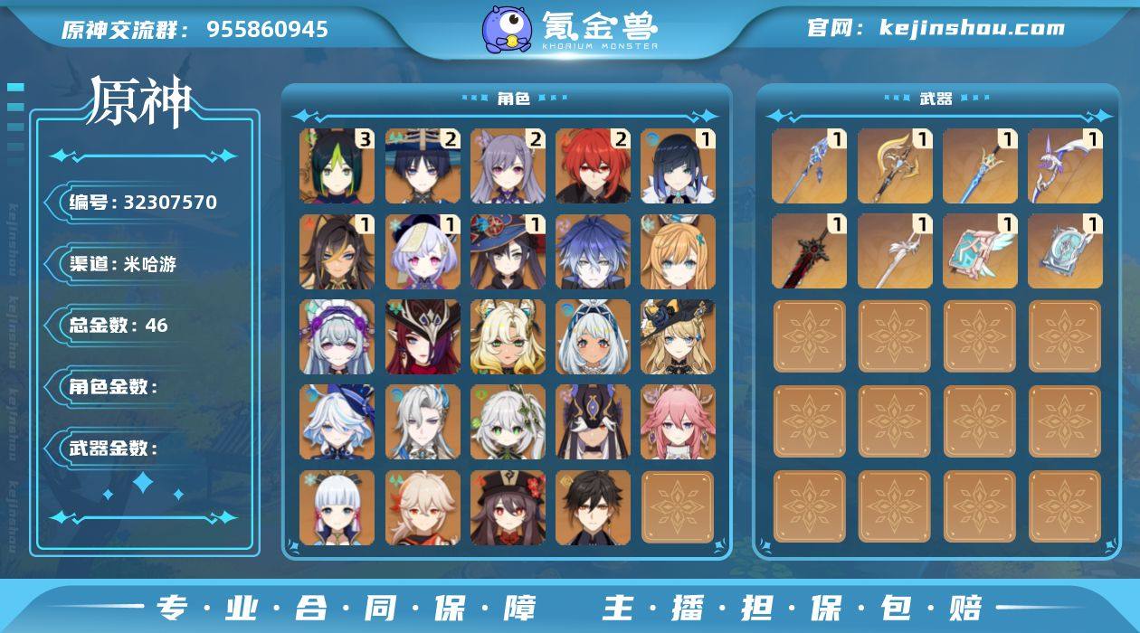邮箱: 未绑定 总黄数: 46 冒险等级: 60 3命金色角色: 三命提纳里 2命金色角色: 二命迪卢克,二命刻晴,二命流浪者 1命金色角色: 一命七七,一命莫娜,一命夜兰,一命迪希雅 0命金色角色: 枫原万叶,神里绫华,钟离,胡桃,八重神子,赛诺,纳西妲,那维莱特,芙宁娜,娜维娅,玛拉妮,希诺宁,恰斯卡,梦见月瑞希,爱可菲,菲林斯 1精武器: 狼的末路,四风原典,天空之卷,阿莫斯之弓,风鹰剑,苍古自由之誓,裁断,血染荒城