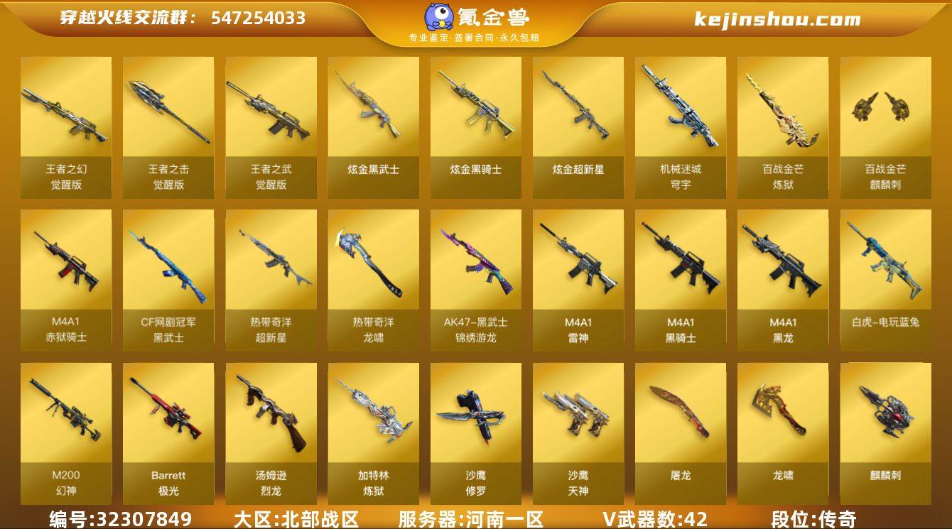 陕西一区-101V-3王者武器数-1炫金武器数 【热门武器】:QBZ03-金色蔷薇,Scar Light-白虎,HK417-朱雀,M200-幻神,M200-竞技荣光,死亡之眼,金色小号,C.A.T,M4A1-黑骑士*4,汤姆逊-烈龙*8,RPK-盘龙*6,加特林-炼狱,斯泰尔-蝴蝶,COP-堕天神,沙鹰-修罗*3 【王者炫金武器】:王者之怒,炫金天龙 【音效卡】:M4A1-黑骑士音效卡,Barrett-毁灭音效卡 【皮肤】:汤姆逊-烈龙-末日皮肤*4,毁灭-暗月,毁灭-CFS2020,毁灭-黑大圣皮肤,毁灭-英雄计划 皮肤,黑骑士-暗月*2,无影-暗月,死神-秘银,战神-粉色甜心皮肤*3,战神-紫绶金章皮肤*8,战神-流金岁月皮肤*3,AWM-天龙-传奇70KG 【角色】:樱,暗夜-X,嘉年华灵狐,娟娟,潜龙队-X,铁骑-乘风破浪,铁骑荣耀,新娜塔莎,影武者-X,职业选手 【人偶武器】:天龙-曼陀罗,火麒麟-灵狐,斯泰尔-蝴蝶,AWM-灵狐-15周年嘉年华,C.A.T,迷你深渊冰龙,迷你牛牛*4,迷你生化手雷,深渊终结者手雷*3,闪光弹-小乔 【暴走生化】:死亡之眼 【挑战大师】:神圣爆裂者III,激光毁灭者III,KAC-圣炎切割者III,神圣爆裂者-末日III*2,阐释者III*2 【英雄级武器】:AK47-火麒麟,M4A1-雷神,M4A1-黑骑士*4,AK47-无影,AK47-黑武士*2,AK12-天启,AN94-超新星,HK417-朱雀,Scar Light-白虎,无影-神兵利器,M4A1-玫瑰精灵,QBZ03-金色蔷薇,AK-47-猩红传说*11,AK47-B-战神,黑骑士-海王,AWM-天龙*2,Barrett-毁灭,AWM-裁决,M200-幻神,M200-竞技荣光,王者之怒-觉醒版,RPK-盘龙*6,加特林-炼狱,汤姆逊-烈龙*8,AA-12-雷霆,沙鹰-修罗*3,沙鹰-天神,COP-堕天神,屠龙*2,龙啸,马来剑-夜魔,擎天*4,麒麟刺,擎天-竞技荣光,斩神刀-雷暴,王者之锋-觉醒版,高爆手雷-雷暴*3,高爆手雷-夜魔,高爆手雷-竞技