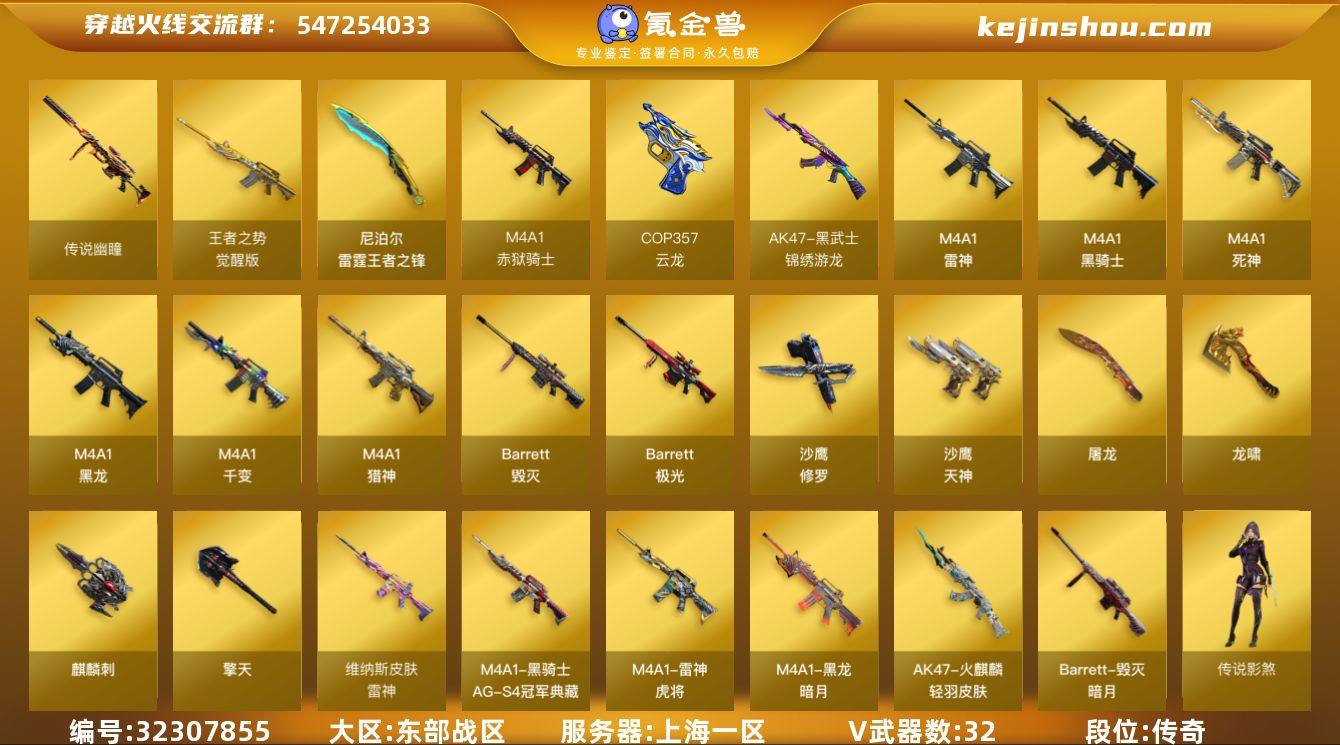【931087】上海一区-36V-11王者-0炫金 【传说武器】:传说幽瞳 【传说角色】:传说影煞 【热门武器】:传说幽瞳,M4A1-黑骑士*3,沙鹰-修罗*3 【王者炫金武器】:雷霆王者之锋 【皮肤】:雷神-虎将,雷神-维纳斯皮肤,雷神-梦蝶 皮肤,火麒麟-轻羽皮肤,毁灭-暗月,毁灭-虹光风暴 皮肤*2,毁灭-英雄计划 皮肤,黑龙-暗月,黑骑士-AG-S4冠军典藏,龙啸-青青莓果 皮肤 【角色】:零,瞳,魅影,战地猎狐,王者樱-热浪之夏,奇洋探员,乔伊教练,修道士,云海玲珑,暗夜-X,电竞少女,飞虎队-X,风暴女,嘉年华灵狐,娟娟,潘多拉-甜心教官,青霞仙子,铁骑荣耀,维纳斯,游珑儿 【人偶武器】:天龙-曼陀罗,迷你深渊冰龙,迷你裂空之翼,迷你波特博士*3,夺魂,迷你牛牛,迷你火种*2,生化手雷-机甲核心,巴雷特-赏金猎人,迷你超能女侍 【挑战大师】:试炼破坏者III,惩戒者III 【英雄级武器】:M4A1-千变,M4A1-黑龙,M4A1-雷神,M4A1-黑骑士*3,M4A1-死神,黑武士-锦绣游龙,M4A1-猎神,王者之势-觉醒版,Barrett-毁灭,Barrett-极光,沙鹰-修罗*3,沙鹰-天神,COP 357-云龙,屠龙*3,龙啸,擎天,麒麟刺,高爆手雷-云龙*3,手雷-热带奇洋,闪光弹-云龙*3,闪光弹-雷霆王者-...