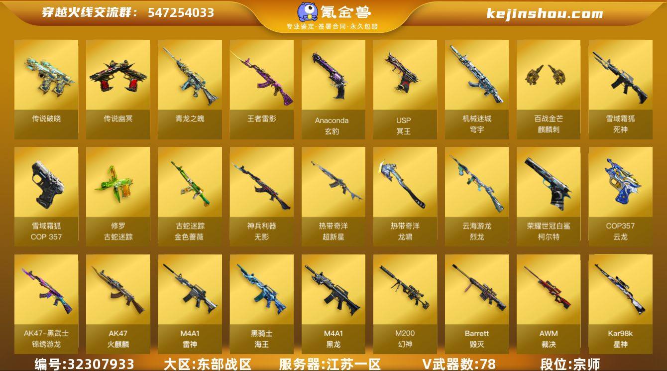 【931261】江苏一区-76V-4王者武器数-0炫金武器数 【王者炫金武器】:青龙之魄,王者雷影 【角色】:电竞教官-云悠悠,关小雨,零·纪元,王者-魅影,雪域霜狐,蛇隐宗,奇洋探员,乔伊教练,云海玲珑,葵-阿尔法武装,暗夜-X,北极狐-X,初恋灵狐,芳心审判者,飞虎队-X,风暴女*2,虎妞,嘉年华灵狐,娟娟,兰妹妹,0号玩家,灵狐者-黄金海岸,潘多拉-X,青霞仙子,蛇姬,斯沃特-X,兔囡囡,雪莉杨,幽,游珑儿 【道具】:AG战队炫彩背包,BS战队炫彩背包,CFPL炫彩背包,CFS限定背包,EP战队炫彩背包,QQ会员专属背包,云海游龙炫彩背包,亚洲杯纪念炫彩背包,古蛇迷踪炫彩背包,奇洋探员-海龟背包,热带奇洋炫彩背包,百战金芒炫彩背包,超级背包,雪域霜狐炫彩背包,哔哩哔哩名片,女皇终结者-魔龙之吻,救世主-黑桃战神,绿色巨人,灵魂忍者,变异宝贝,迷雾幽灵,生化弹匣,夺命之镰,防化服*5,金色流光-枪王排位,星辰流光-枪王排位,巅峰赛先锋-金色流光,枪王排位28赛季金色流光,枪王排位29赛季金色流光,语音特效-怀旧,古蛇迷踪打击特效,雪域霜狐表情,蛇隐宗表情,萌萌小葵表情,热带奇洋表情,云海游龙表情,EP战队收纳包,EP战队名片,EP战队喷图,EP战队击...