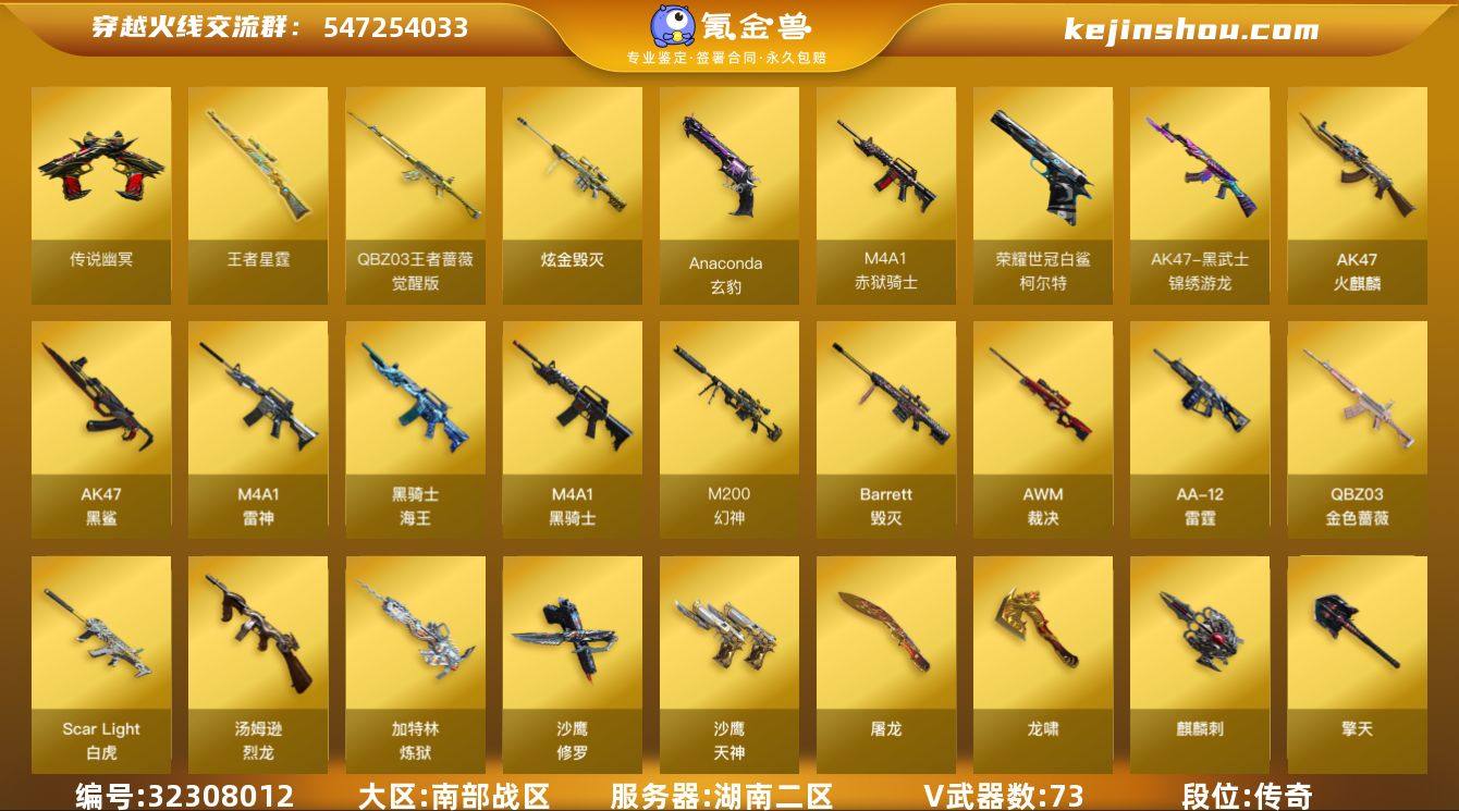【931276】湖南二区-78V-4王者武器数-1炫金武器数 【传说武器】:神威天绫,传说幽冥 【传说角色】:传说影煞 【热门武器】:传说幽冥,G36C-幻影,QBZ03-金色蔷薇,Scar Light-白虎,M4A1-青龙,M200-幻神,柯尔特-荣耀世冠白鲨2023,死亡之眼,M4A1-黑骑士*3,汤姆逊-烈龙*7,加特林-炼狱,斯泰尔-蝴蝶,MK5-炽火炎龙,羊驼玩偶,USP-雷暴,沙鹰-修罗*5,炽芒蝶刃*2,炽芒蝶刃-荣耀世冠白鲨2023 皮肤 【王者炫金武器】:王者星霆,王者冰锋,炫金毁灭 【音效卡】:M4A1-黑骑士音效卡,AWM-裁决音效卡,Barrett-碧霄极光音效卡,AWM-昌龙-怀旧音效卡 【皮肤】:幻神-星火小队签名臻藏版 皮肤,白虎-量子聚变 皮肤,裁决-巅峰荣耀 皮肤,雷神-能量核心,雷神-R.LGD-CFPLS18冠军,火麒麟-冠军之心,火麒麟-新春kwai乐,毁灭-暗月*2,毁灭-冠军之怒,毁灭-SV-CFPLS16冠军,黑骑士-暗月*3,无影-暗月*3,无影-霓裳皮肤,死神-秘银,天启-暗月*4,炼狱-星空,修罗-能量核心,天神-暗月*3,屠龙-破浪逐光 皮肤,龙啸-巅峰荣耀 皮肤,炽芒蝶刃-荣耀世冠白鲨2023 皮肤 【角色】:隼,战地猎狐,王者-瞳-闭月羞花,王者-魅影,蛇隐宗,暗夜-X,初恋灵狐,飞虎队-X,嘉年华灵狐,灵狐者...