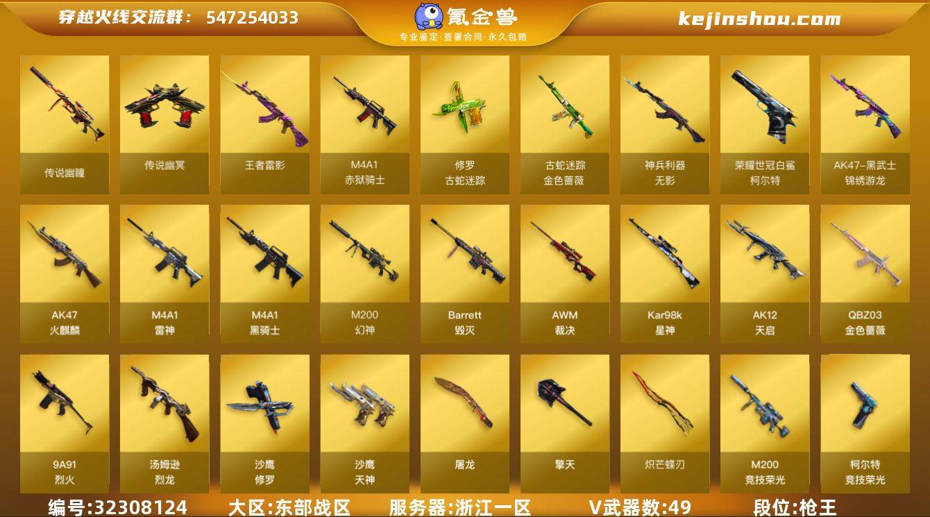 【931275】浙江一区-53V-2王者武器数-0炫金武器数 【传说武器】:传说幽瞳,传说幽冥 【热门武器】:传说幽瞳,传说幽冥,G36C-幻影,QBZ03-金色蔷薇,M200-幻神,柯尔特-荣耀世冠白鲨2023,金色蔷薇-古蛇迷踪,修罗-古蛇迷踪,M200-竞技荣光,Kar98K-星神,牛牛-AK47,M4A1-黑骑士,汤姆逊-烈龙*6,幻神-魅影,COP-白鲨,USP-雷暴,沙鹰-修罗,炽芒蝶刃 【王者炫金武器】:王者雷影 【音效卡】:M200-幻神音效卡,M4A1-黑骑士音效卡,QBZ03-金色蔷薇-古蛇迷踪音效卡,AWM-裁决音效卡,Kar98K-星神音效卡,Barrett-碧霄极光音效卡,死神-雪域霜狐-怀旧音效卡 【皮肤】:幻神-电流骇客 皮肤,幻神-曹操 皮肤,裁决-流光秘银,星神-漫游,雷神-暗月,雷神-蓝风铃 皮肤,火麒麟-雷神,毁灭-战神张飞,黑骑士-电玩青兔皮肤,天罚-孙权 皮肤 【角色】:关小雨,隼,星际战将,零·纪元,战地猎狐,王者-魅影,雪域霜狐,蛇隐宗,乔伊教练,暗夜-X,芳心审判者,飞虎队-X,嘉年华灵狐,娟娟,葵-赛博朋克,龙儿,麻雀,青霞仙子,蛇姬,斯沃特-X,新娜塔莎 【人偶武器】:幻神-魅影,COP-白鲨,火麒麟-灵狐,M4A1-雷神-精英刀锋,异变清道夫-蛇影双骄,USP-摇滚暗灵,Scar Light-马枪...