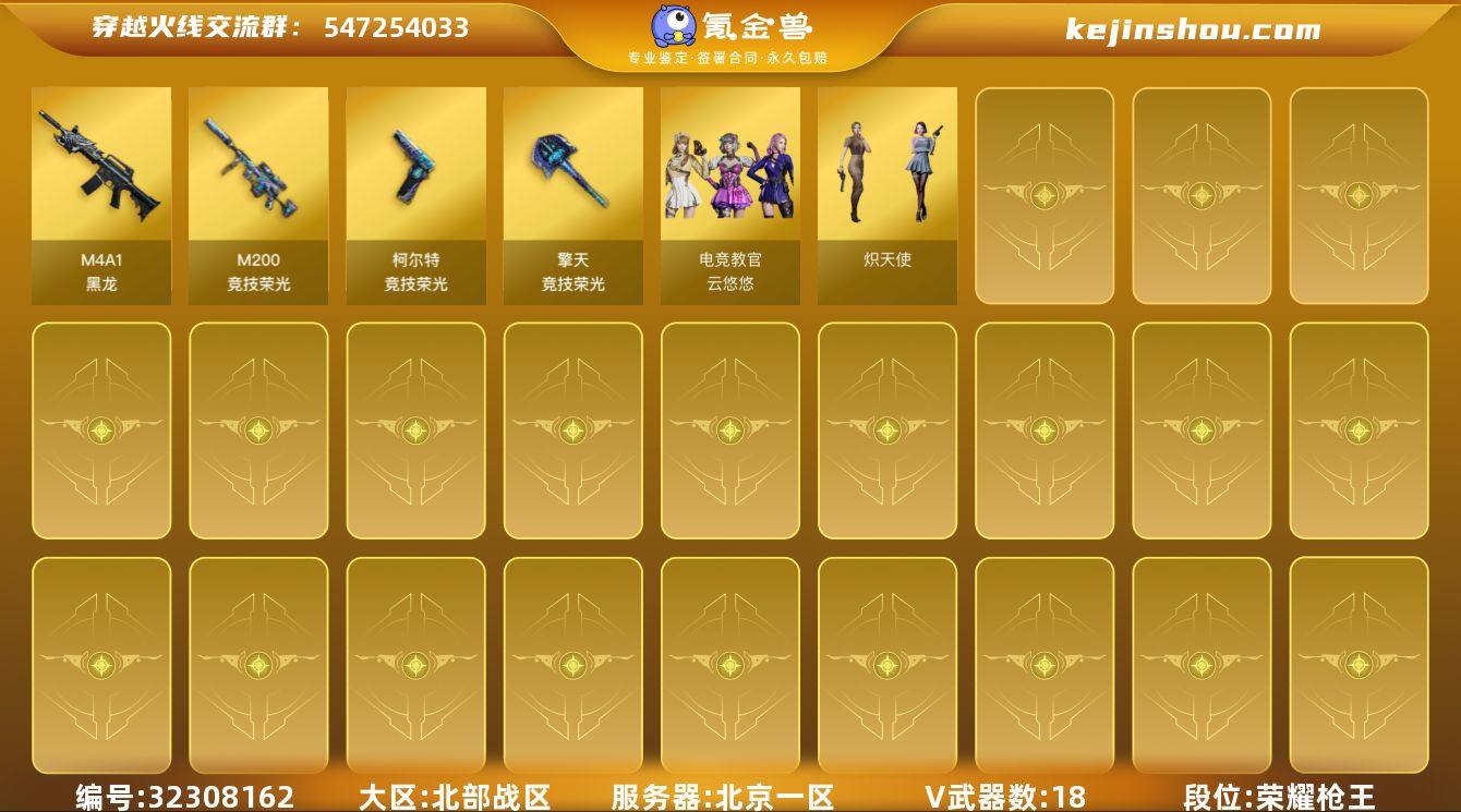 【930861】北京一区-19V-1王者-0炫金 【热门武器】:M200-竞技荣光,USP-钞能力灵狐,USP-雷暴 【皮肤】:毁灭-百城浙江 皮肤 【角色】:电竞教官-云悠悠,炽天使,初恋灵狐 【人偶武器】:USP-钞能力灵狐 【挑战大师】:冰龙粉碎者-白马银枪 【英雄级武器】:M4A1-黑龙,QBZ03-独角-III,M200-竞技荣光,USP-雷暴,柯尔特-竞技荣光,擎天-竞技荣光,高爆手雷-竞技荣光*4,闪光弹-竞技荣光*4,烟雾弹-竞技荣光*4 【道具】:女皇终结者-魔龙之吻,绿色巨人,灵魂忍者,迷雾幽灵,夺命之镰,防化服*2,枪王排位29赛季金色流光,EP战队名片,防弹头盔*4,防弹衣*4,C4工具钳*4,手雷包*4 【特殊枪械】: