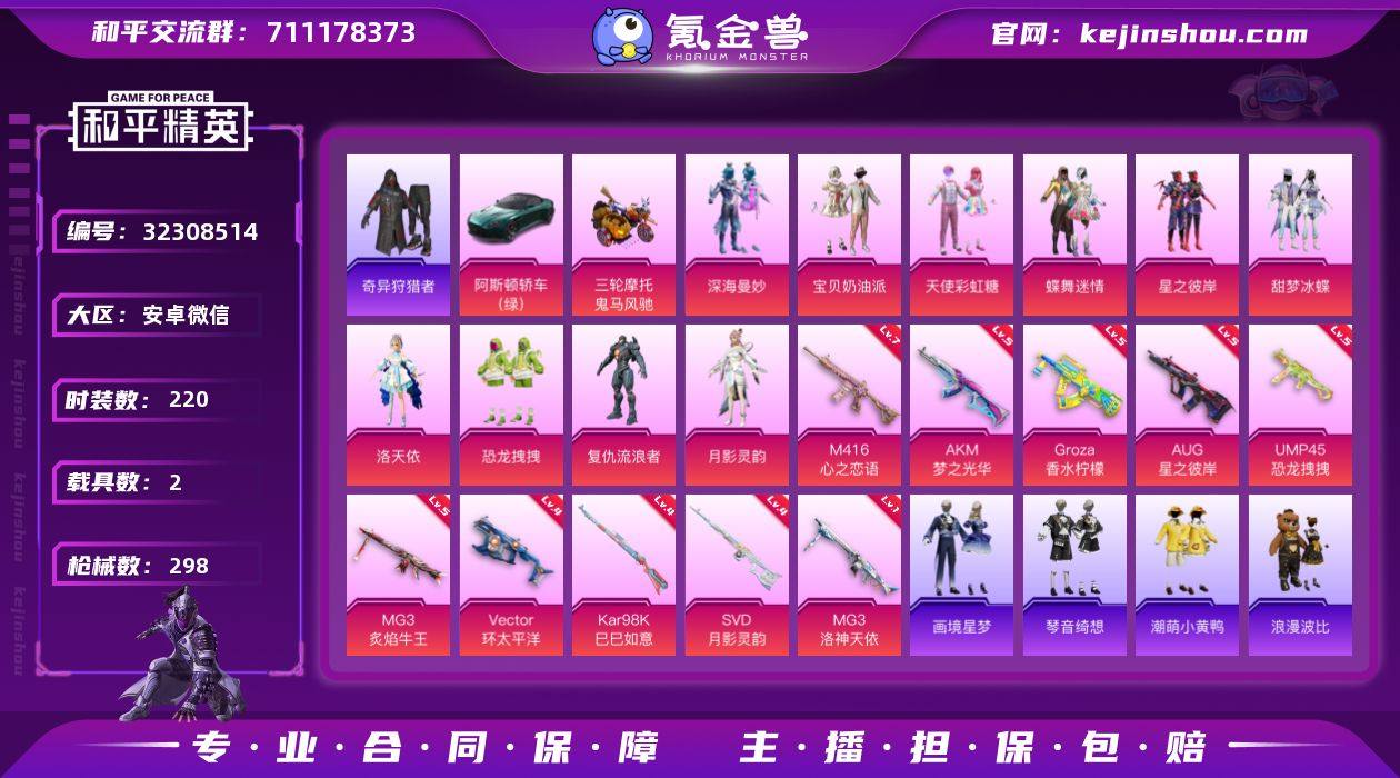 【930551】[安卓 微信-10粉装-13特效枪-2载具-3粉色飞行器-96441热力值-14王牌印记-220套装-298枪皮 暗影哥特 洛天依 M416-心之恋语(七级) 身法号精品小号] 【热门品类】:套装-浪漫天命,套装-奇异狩猎者,角色-军刀雅典娜,套装-金羽特工,套装-星河浪客,套装-潮萌小黄鸭,套装-暗影哥特,套装-浪漫波比 【粉色套装】:粉装-深海曼妙,粉装-宝贝奶油派,粉装-天使彩虹糖,粉装-蝶舞迷情,粉装-星之彼岸,粉装-甜梦冰蝶,角色-洛天依,粉装-恐龙拽拽,角色-复仇流浪者,角色-月影灵韵 【粉色枪皮等级】:AKM-梦之光华(五级),M416-心之恋语(七级),GROZA-香水柠檬(五级),AUG-星之彼岸(五级),UMP45-恐龙拽拽(五级),Vector-环太平洋(四级),AKS-74U-森灵之息(四级),Kar98K-巳巳如意(四级),Mk14-福马献瑞(五级),SVD-月影灵韵(四级),AA12-G-萌骑幻想(四级),MG3-洛神天依(一级),MG3-炙焰牛王(五级) 【粉色载具】:阿斯顿马丁DBS(绿),鬼马风驰 【粉色枪皮】:AKM-梦之光华,M416-心之恋语,GROZA-香水柠檬,AUG-星之彼岸,UMP45-恐龙拽拽,Vector-环太平洋,AKS-74U-森灵之息,Kar98K-巳巳如意,Mk14-福马献瑞,SVD-月影灵韵,AA12-G-萌骑幻想,MG3-洛神天依,MG3-炙...