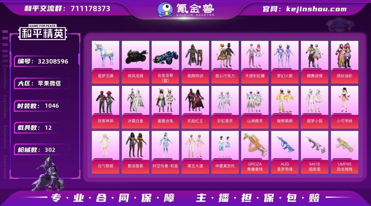 苹果 微信-6神装-31粉装-35特效枪-16载具-19粉色飞行器-257169热力值-32王牌印记-447套装-572枪皮 【红色神装等级】:魔童闹海-敖丙(五级),魔童闹海-哪吒(一级),灵猫魔法师-塞维尔(一级),盛世惊鸿-云鸾(一级),幽焰骑士-维塔(一级),精灵之光-露米娜(一级) 【红色角色神装】:魔童闹海-敖丙,魔童闹海-哪吒,灵猫魔法师-塞维尔,盛世惊鸿-云鸾,幽焰骑士-维塔,精灵之光-露米娜 【热门品类】:粉装-梦幻火箭,粉装-缤纷油彩,套装-浪漫天命,套装-派对舞王,套装-深海小丑鱼,套装-小丑鱼,套装-胖达圆圆,套装-金羽特工,套装-SS1特训,套装-龟仙人,套装-潮萌小黄鸭,套装-暗影哥特,角色-8号机,角色-Mark.06,小恶魔头饰,熔岩游骑兵面罩,熔岩游骑兵连帽夹克,套装-红熊茄茄 【粉色载具】:路特斯ELETRE(冰川蓝),玛莎拉蒂Ghibli(金),宾利欧陆GT敞篷(火焰橘),迈凯伦570S(天际蓝),保时捷Taycan 旅行版(冰莓粉),合金龙骨(绿),双人摩托-梦幻火箭,疾风龙骑,幽焰风驰摩托车,盛世惊鸿摩托车,空客H135-蔚蓝之翼,僚机-圣域龙宝,快艇-自由的鲸,星梦玉骢,护世瑞兽,晶梦灵驹,黑曜夜骑,冰绡玉鳞 【粉色套装】:粉装-宝贝奶油派,粉装-天使彩虹糖,粉装-蝶舞迷情,粉装-梦幻火箭,粉装-天启纪元,粉装-缤纷油彩,粉装-放客神游,粉装-潮汐统领,粉装-王牌四分卫,粉装-橘柚倾心,角色-歌者泠鸢,粉装-暗夜鎏金,粉装-仲夏莫吉托,粉装-飒粉甜心,粉装-未来歌姬,粉装-闲梦青缨,粉装-莲影清波,角色-烟云彩露,套装-创世·救赎,粉装-金丰海韵,角色-狂花道·不知火舞,角色-千金淑猫,角色-樱桃泡泡,粉装-雪月幻音,粉装-星穹咏叹调,角色-冷漠罗丽,角色-荧海星豚,角色-绯穹魔姬,角色-奇迹舞步 美雪,角色-羊梦糖心,角色-异瞳寒姬 【粉色枪皮等级】:AKM-绿萝繁花(五级),AKM-幽焰骑士...