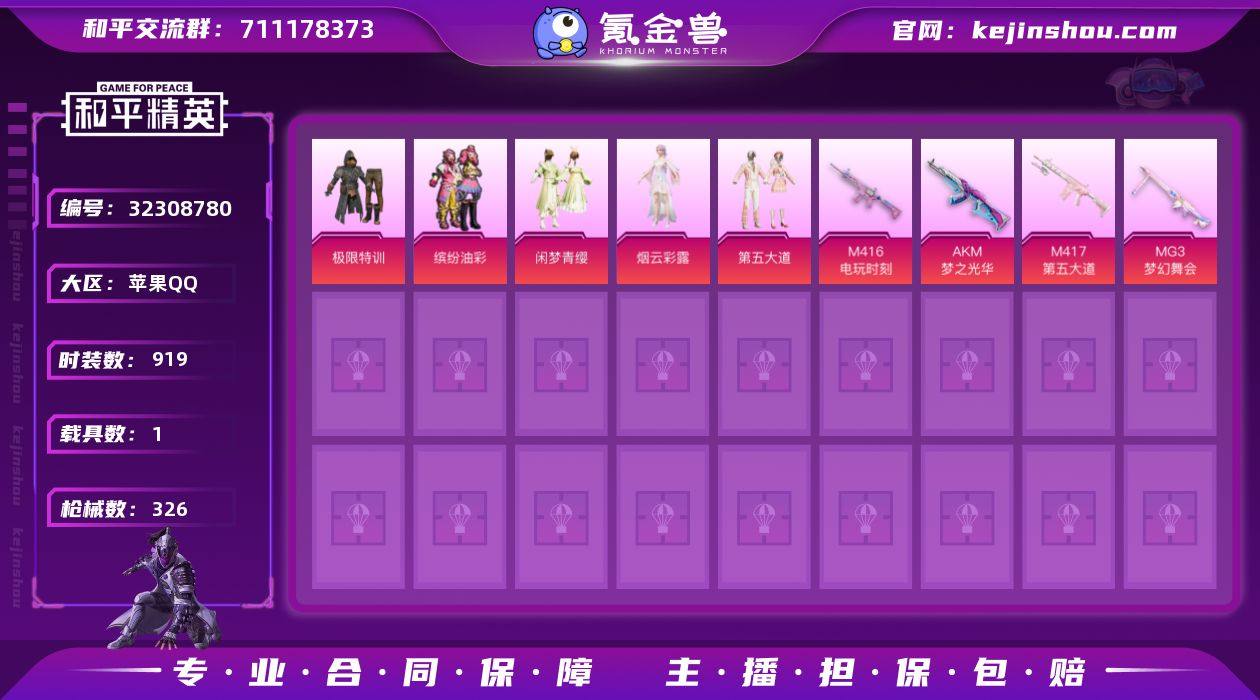 苹果 手Q-1神装-7粉装-15特效枪-5载具-5粉色飞行器-77519热力值-5王牌印记-144套装-229枪皮 【红色神装等级】:辉羽雀灵-初翊(一级) 【红色角色神装】:辉羽雀灵-初翊 【热门品类】:套装-奇异狩猎者,套装-动感兔斯基人偶服,套装-浪漫波比 【粉色载具】:特斯拉Model 3(珍珠白),阿斯顿马丁DBS(金),合金龙骨(蓝),黑曜夜骑,辉羽雀灵自行车 【粉色套装】:粉装-天启纪元,粉装-金属狂野,粉装-古堡领主,粉装-心之恋语,粉装-香水柠檬,角色-智耀战神,角色-荧海星豚 【粉色枪皮等级】:AKM-炫紫旋律(五级),SCAR-L-梦幻火箭(四级),M416-心之恋语(四级),M416-灵猫魔法师(三级),GROZA-镜光银凌(四级),AUG-暖羊咩咩(五级),M762-甜蜜誓约(五级),汤姆逊-星月云朵(四级),AKS-74U-星穹咏叹调(四级),Kar98K-伏魔团(四级),Kar98K-巳巳如意(五级),Mk14-甜梦熊击(五级),DP-28-扶摇飞仙(四级),DP-28-豹影疾电(一级),MG3-辉羽雀灵(三级) 【粉色枪皮】:AKM-炫紫旋律,SCAR-L-梦幻火箭,M416-心之恋语,M416-灵猫魔法师,GROZA-镜光银凌,AUG-暖羊咩咩,M762-甜蜜誓约,汤姆逊-星月云朵,AKS-74U-星穹咏叹调,Kar98K-伏魔团,Kar98K-巳巳如意,Mk14-甜梦熊击,DP-28-扶摇飞仙,DP-28-豹影疾电,MG3-辉羽雀灵 【粉色飞行器】:梦幻火箭飞行器,炫紫旋律飞行器,神秘黑猫飞行器,雀灵庇佑飞行器,灵猫魔法师飞行器 【粉色降落伞】:春暖花开降落伞,梦幻火箭降落伞,华贵君王降落伞,星之信仰降落伞,炫紫旋律降落伞,神秘黑猫降落伞,古堡领主降落伞,伏魔团降落伞,甜蜜誓约降落伞,四圣焕新降落伞,心之恋语降落伞,齐天大圣降落伞,樱桃泡泡降落伞,绯果甜心降落伞,星穹咏叹调降落伞,辉羽雀灵降落伞,灵猫魔法师降落伞 【稀有套装】:套装-燕燕于飞,套装-鱼渊荷华,角色-糖霜甜心,角色-冷霜之星,...