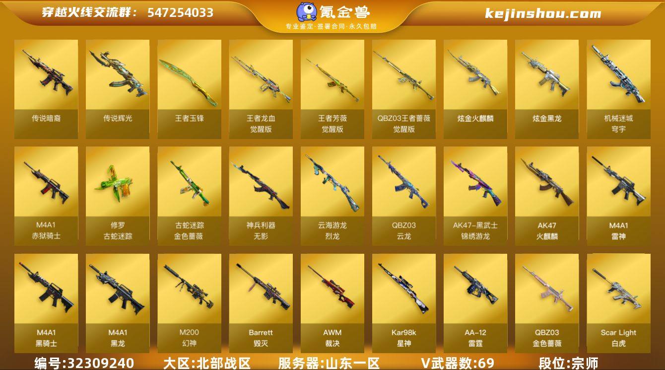【931237】山东一区-76V-8王者武器数-2炫金武器数 【传说武器】:传说暗裔,传说辉光 【传说角色】:传说艾莉莎 【热门武器】:传说暗裔,传说辉光,QBZ03-金色蔷薇,Scar Light-白虎,M200-幻神,金色蔷薇-古蛇迷踪,修罗-古蛇迷踪,M200-竞技荣光,柯尔特-冠军之特,荣耀世冠-柯尔特,Kar98K-星神,M4A1-黑骑士,斯泰尔-蝴蝶,USP-雷暴*2,沙鹰-修罗,柯尔特-赛博朋克,荣耀世冠-龙啸*3 【王者炫金武器】:王者玉锋*2,炫金火麒麟,炫金黑龙 【音效卡】:AK47-火麒麟音效卡,M4A1-雷神音效卡,M4A1-黑骑士音效卡,Barrett-毁灭音效卡,Scar Light-白虎音效卡 【皮肤】:幻神-冠军之幻,裁决-胜者为王 皮肤,星神-枪娘默 皮肤,雷神-耀金皮肤,雷神-荣耀世冠AG,雷神-宇航兔皮肤,雷神-云海游龙皮肤,雷神-源计划2.0专属 皮肤,雷神-神秘按键 皮肤,火麒麟-AG战队皮肤,火麒麟-雷神,火麒麟-轻羽皮肤,火麒麟-平天大圣,火麒麟-QQ会员,火麒麟-荣耀世冠AG,火麒麟-百城,火麒麟-心动糖果,毁灭耀金皮肤,毁灭-QQ会员,毁灭-风暴*2,毁灭-百城浙江 皮肤,毁灭-英雄计划 皮肤,黑龙-能量核心,黑龙-墨子皮肤,黑骑士-暗月,烈火-熔核皮肤,屠龙-QQ会员,屠龙-荣耀世冠AG 【角色...
