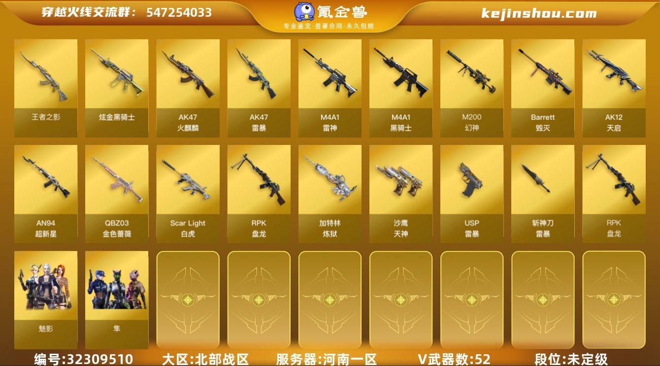 【33】河南一区-80V-2王者武器数-3炫金武器数 【热门武器】:QBZ03-金色蔷薇,M200-幻神,死亡之眼*2,Kar98K-星神,M4A1-黑骑士,汤姆逊-烈龙,RPK-盘龙*2,加特林-炼狱*2,雷神-小红,沙鹰-修罗*6 【王者炫金武器】:炫金无影,炫金千变,炫金毁灭 【音效卡】:Barrett-毁灭音效卡 【皮肤】:QBZ03-AG-CFPLS19冠军,雷神-能量核心,雷神-星空,雷神-诺拉 皮肤,火麒麟-冠军之心,火麒麟-百城,火麒麟-心动糖果,毁灭-暗月,毁灭-星空,毁灭-直播专属,黑龙-能量核心,黑骑士-冠军之势,无影-能量核心,天龙-秘银,极光-能量核心,炼狱-月 皮肤,修罗-能量核心,麒麟刺-甜蜜糖果 皮肤 【角色】:葵,樱,炫,王者之瞳,蛇隐宗,乔伊教练,暗夜-X,风暴女,嘉年华灵狐,娟娟,猎狐者-追月,零-水下丽影,灵狐者-七夕宝贝,龙儿,潘多拉-X,潜龙队-X,邱刚敖,蛇姬,斯沃特-X,蜀雪,铁骑荣耀,雪莉杨 【人偶武器】:雷神-小红,AWM-灵狐-15周年嘉年华,COP-旗袍,迷你深渊冰龙*2,迷你牛魔王,迷你牛牛,迷你生化手雷 【暴走生化】:死亡之眼*2 【挑战大师】:冰龙粉碎者-白马银枪,激光毁灭者III-白马银枪,神圣爆裂者-末日III 【英雄级武器】:M4A1-千变,AK47-火麒麟*3,M4A1-黑龙*2,M4A1-雷神,M4A1-黑骑士,AK47-无影,M4A1-死神,AK12-天启,AN94-超新星,M4A1-龙血*2,M4A1-雷霆,无影-神兵利器,M4A1-玫瑰精灵,QBZ03-金色蔷薇,烈火-动感闪耀,王者之魄-觉醒版,AK-47-猩红传说,AWM-天龙,Barrett-毁灭*3,M200-幻神,Kar98K-星神,RPK-盘龙*2,加特林-炼狱*2,汤姆逊-烈龙,AA-12-雷霆,沙鹰-修罗*6,沙鹰-天神,COP-雷霆*2,天神-动感闪耀,屠龙*2,龙啸,擎天*3,麒麟刺*2,屠龙-动感闪耀,王者之锋-觉醒版,高爆手雷-雷霆*7,手雷-动感闪耀,高爆手雷-古蛇迷踪,闪光弹-雷霆*7,烟雾弹-雷霆*7,烟...
