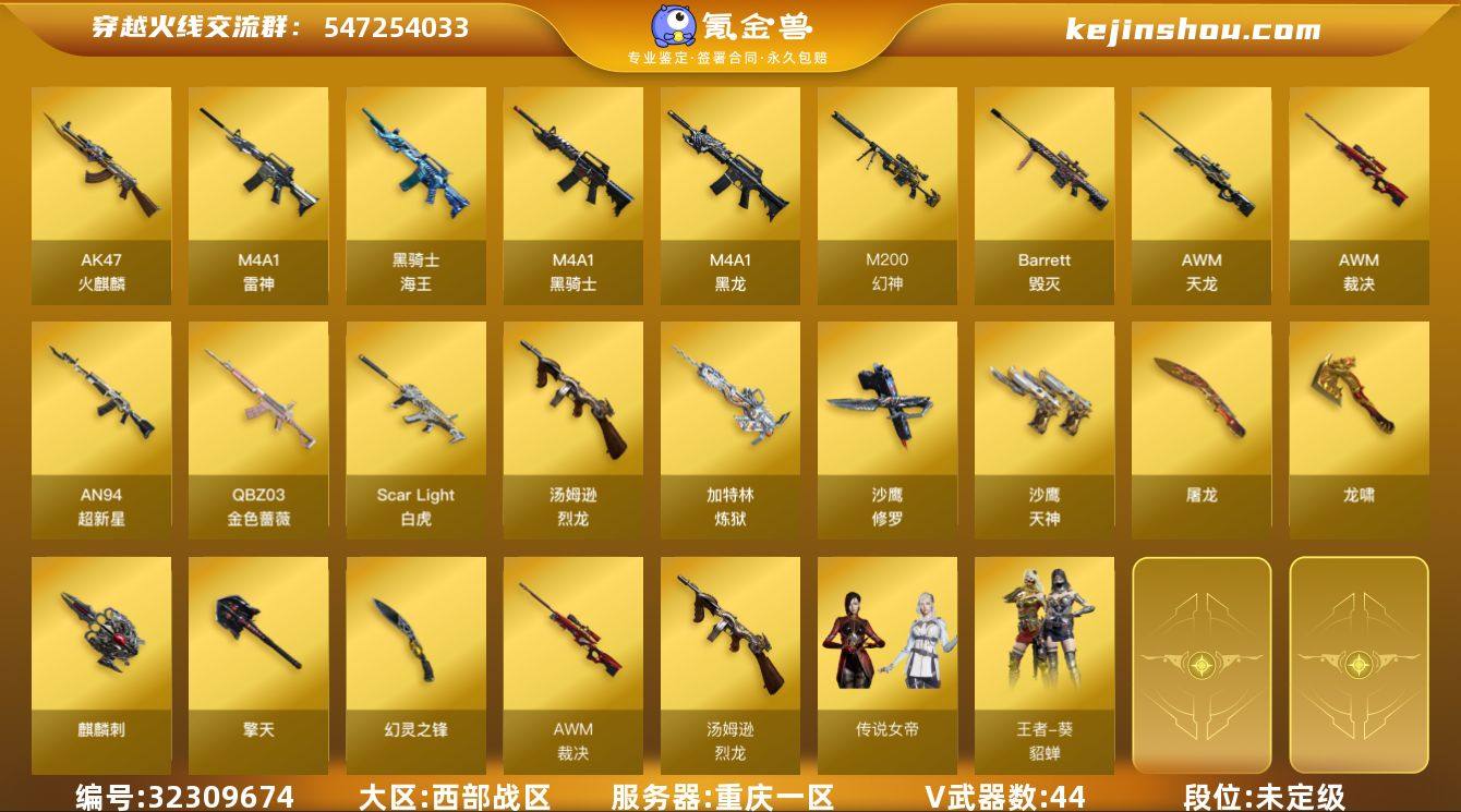 可二次实名 重庆一区45v5王者可排位/会员6/S1赛季未定级/王者之石106个/【四防】传说女帝/M200幻神+幻神荣耀世冠白鲨+幻神黄忠+幻神紫橙光效/2把Knife-冠军之刃/Scar Light-白虎/QBZ03-金色蔷薇/白虎之魄/炼狱/烈龙/修罗/天神/2把柯尔特-冠军之特/3套幻灵雷/】【绝迹语音包/火麒麟音效卡/黑骑士音效卡/雷神音效卡/毁灭音效卡/金色蔷薇音效卡/】【/黑骑士-白马银枪/QBZ03-冠军之薇/白虎-霓虹机甲皮肤/黑龙-冠军之武/裁决-过载皮肤/黑骑士-冠军之势/火麒麟-心动糖果/修罗-冠军之魂/火麒麟-华夏之心/火麒麟-平天大圣/M4A1-黑龙-361/AK47-老兵传说皮肤/雷神-虎将/火麒麟-CFSTAR/雷神-荣耀之魄/屠龙-荣耀之锋/毁灭-荣耀之怒/】【四防】王者-葵-貂蝉/乔伊教练/王者零-传说之路/职业选手/】【/雷霆王者之锋-觉醒版/高爆手雷-雷霆王者/闪光弹-雷霆王者/M4A1-雷神-精英刀锋/乱世-超越2/神圣爆裂者-末日III/M37-葵/】【烟雾保护头盔/战舰头盔/AG战队护目镜/闪光护目镜/超级对讲机/战舰玩偶/虎牙炫彩背包/全能枪王背包/战舰背包/炫彩背包/战舰军袋/A背包套装扩展券/全背包/永久防弹衣防弹头盔手雷包C4工具钳】详情看图★星迈游★低价出售找回包赔(截图展示段位不代表实际段位,如赛季更新...
