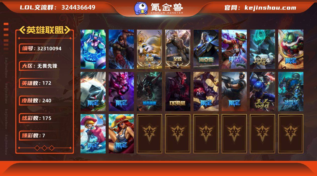 【LSA1329】156英雄/335皮肤/2终极/6神话/50限定/3臻彩/74炫彩/21传说/97史诗/黄金账号等级:368/10周年 安妮/源代码 乐芙兰/海克斯 阿利斯塔/海克斯 嘉文四世/至臻 K/DA 卡莎/至臻 烈焰美人 薇恩/吕布 奉先 炫金战神/霸天巨兽·雪崩 墨菲特/源计划: 火 菲奥娜 惩戒/龙年 孙悟空/南天之怒 沃里克/春晖神女 拉克丝/甜心宝贝 安妮/觅心游侠卢锡安/幸福女神 乐芙兰/圣诞狂欢 努努/圣诞狂欢 时光/“主人不要我了” 阿木木/胡桃夹子 小丑/平安夜女神 娑娜/英勇玩具兵船长/邪恶圣诞老人 维迦/冰雪节 茂凯/冬季仙境 发条/雪默丁格/魄罗骑士 瑟庄妮/冰雪节 炼金/冰雪兽 纳尔/灵魂守卫/未来战士/送披萨的小姐姐 希维尔/冠军之刃 锐雯 2016/S2 暗杀星 蒙多/S2 暗杀星 伊泽瑞尔/S4 SSW 炼金/S4 SSW 图奇/S4 SSW 雷恩加尔/S6 SKT T1 扎克/胜利枪神 格雷福斯/胜利女神 奥莉安娜/胜利之剑 亚托克斯/胜利机器人 布里茨/胜利之王 泰达米尔/胜利女神-菲奥娜/海贼 瑞兹/南瓜头 费德提克/无头骑士 赫卡里姆/蓝色忧郁 崔斯特/暗影 沃里克/野兽猎人 德莱文/野兽猎人 泰达米尔/勇者阿狸/电玩战魂 赫卡里姆/都铎王朝 图奇/防暴士兵 格雷福斯/防暴士兵 辛吉德/防暴天使 凯尔/惊悚派对 阿木木/警用试作体K-9 内瑟斯/鸡里奥/克格汪/地狱之门卫士 加里奥/战地机甲 厄加特/战场女武神 凯尔/钢铁之翼 凯尔/恶魔男爵 瑞兹/提莫:"约德尔人的一大步"/约德尔国队长 提莫/烈焰雄心 崔丝塔娜/合金巨兽 努努和威朗普/女皇 艾希/双重冰晶 艾尼维亚/黯晶凤凰 艾尼维亚/律政大亨 蒙多/死亡骑士 盖伦/枯萎之壤 泽拉斯/黯黑魔龙 希瓦娜/偶像歌手 阿狸/符文战熊 沃利贝尔/宇航员 诺提勒斯/霸天异形 卡兹克/灌篮高手 德莱厄斯/冰霜烈焰 安妮/皇家火炮手 崔斯特/特战先锋 赵信/绞肉机角斗士 赵信/铁钩船长 费德提克/天人合一 易/侍魂 易/地狱火 阿利斯塔/战争机器...