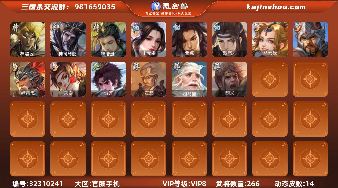 【621】官阶:骠骑将军;VIP等级:VIP8;史诗武将数量:16;动态皮肤数量:14;武将总数:266;史诗宝珠数量:0;将魂数量:519;神将:5;魏国史诗武将:10;蜀国史诗武将:4;吴国史诗武将:1;群史诗武将:3 神赵云,神司马懿,神陆逊,神关羽,神吕蒙,王元姬,曹纯,戏志才,关索,马云騄,王平,界黄忠,贺齐,左慈,司马徽,麹义,神诸葛亮-孟章诛邪(动态),神曹操-天下归心,邓艾-神兵天降(动态),界邓艾-神兵天降(动态),王异-轻燕掠影(动态),钟繇-稳定关右(动态),界王异-轻燕掠影(动态),程昱-泰山捧日(动态),黄月英-鼠年春节(动态),界黄月英-鼠年春节(动态),小乔-猪年大雪(动态),界小乔-猪年大雪(动态),孙鲁育-猪年春节(动态),孙茹-鱼游濠水(动态),董白-猪年春节(动态),兀突骨-鼠年春节(动态)