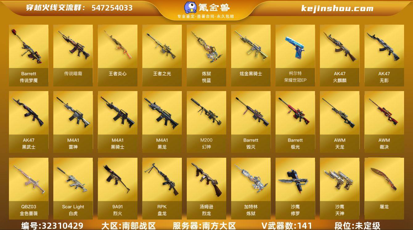 【34】44V/102级/荣耀元首/6王者/1炫金/3英雄/M200-幻神/M200-竞技荣光/死亡之眼/毒蜂/M4A1-黑骑士/汤姆逊-烈龙/RPK-盘龙/加特林-炼狱/斯泰尔蝴蝶/炼狱泡泡象/沙鹰-修罗/黄金猫猫手套-白鲨/蝴蝶斯泰尔+6烈龙/王者霜心/炫金黑骑士/屠龙动感闪耀音效卡/Barrett-毁灭音效卡/Barrett-极光音效卡/白鲨语音包/火线妹语音包/M200-幻神-黄忠/M200-幻神-荣耀世冠白鲨/烈龙-星空/雷神-虎将/雷神-耀金皮肤/雷神-宇航兔/火麒麟-华夏之心/毁灭-星空/毁灭-冠军之怒/毁灭-战神张飞/M4A1-黑龙-361/AK47-黑武士-361/AK47-B-常胜将军-刘备/AK47-B-常胜将军-孙权/炼狱-星空/炼狱-泡泡象/屠龙-QQ会员/擎天-冠军之击/麒麟刺-月皮肤/魅影/晴雅/隼/王者-零/王者-魅影/王者-沙漠玫瑰/乔伊教练/暗夜-X/初恋灵狐/芳心审判者/风暴女/虎妞/嘉年华灵狐/娟娟/卡塔琳娜/兰妹妹/猎狐者-追月/灵动武士/零-水下丽影/灵狐-花神/灵狐者-X/龙儿-小淘气/麻雀/曼陀罗-X/曼陀罗-礼服/女主播/潘多拉-甜心教官/潜龙队-X/青霞仙子/斯沃特-X/铁骑荣耀/兔囡囡/新娜塔莎/夜玫瑰-幻能朋克/职业选手/天龙-曼陀罗/斯泰尔-枪娘暗刃/AWM-灵狐-15周年嘉年华/夺魂/迷你生化手雷/深渊终结者手雷/迷你超能女侍/迷你巨石泰坦-魔花研究所/灵狐娃娃手雷/异变清道夫/超级对讲机/6烈龙/6盘龙/冰龙粉碎者-白马银枪/神圣爆裂者-末日/AK47-火麒麟/M4A1-雷神/无影-神兵利器/烈火-动感闪耀/AK-47-猩红传说/Barrett-毁灭/Barrett-极光/Barrett-朱雀/王者之怒-觉醒版/王者之决-觉醒版/炼狱-悦蓝-觉醒版/柯尔特-竞技荣光/王者之灵-觉醒版/天神-动感闪耀/屠龙/龙啸/擎天/麒麟刺/擎天-竞技荣光/唐刀神工天巧/屠龙-动感闪耀/王者之锋-觉醒版/高爆手雷-竞技荣光/高爆手雷-神工天巧/手雷-动感闪耀/闪光弹-幻灵/闪光弹-竞技荣光/闪光弹-神工天巧/烟雾弹-竞技荣光/BS战队炫彩背包/冰冰企鹅背包-...