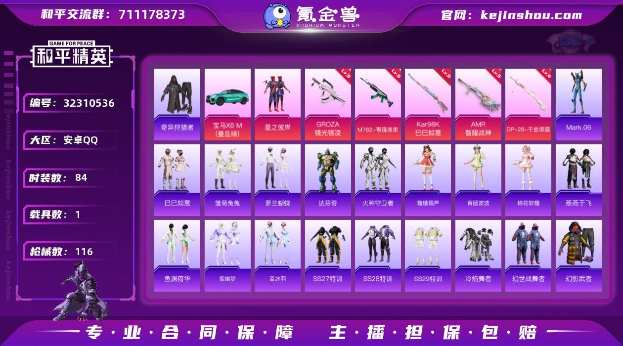 安卓 手Q-1粉装-8特效枪-1载具-2粉色飞行器-35530热力值-3王牌印记-84套装-116枪皮 【热门品类】:套装-奇异狩猎者,角色-Mark.06 【粉色套装】:粉装-星之彼岸 【粉色枪皮等级】:GROZA-镜光银凌(五级),M762-青锋波束(五级),ACE32-萌骑漫游(二级),AKS-74U-森灵之息(五级),Kar98K-巳巳如意(五级),Mk14-福马献瑞(五级),AMR-智耀战神(五级),DP-28-千金淑猫(四级) TD263210 【粉色载具】:宝马X6 M(曼岛绿) 【粉色枪皮】:GROZA-镜光银凌,M762-青锋波束,ACE32-萌骑漫游,AKS-74U-森灵之息,Kar98K-巳巳如意,Mk14-福马献瑞,AMR-智耀战神,DP-28-千金淑猫 【粉色飞行器】:炫彩糖果飞行器,极意拳锋飞行器 【粉色降落伞】:炫紫旋律降落伞,青春物语降落伞,精灵梦叶罗丽降落伞,初号机 觉醒Ver.降落伞,忍者神龟降落伞,千金淑猫降落伞,临安公主降落伞,异瞳寒姬降落伞,炫彩糖果降落伞 【稀有套装】:套装-巳巳如意,套装-雪国风尚,套装-炫彩糖果,套装-彩虹骑师,套装-马上有钱,套装-雏菊兔兔,套装-萝兰蝴蝶,角色-达芬奇,套装-火种守卫者,套装-糖糖葫芦,套装-青团波波,套装-棉花软糖,套装-燕燕于飞,套装-鱼渊荷华,套装-紫幽梦,套装-蓝冰羽 【稀有枪皮...
