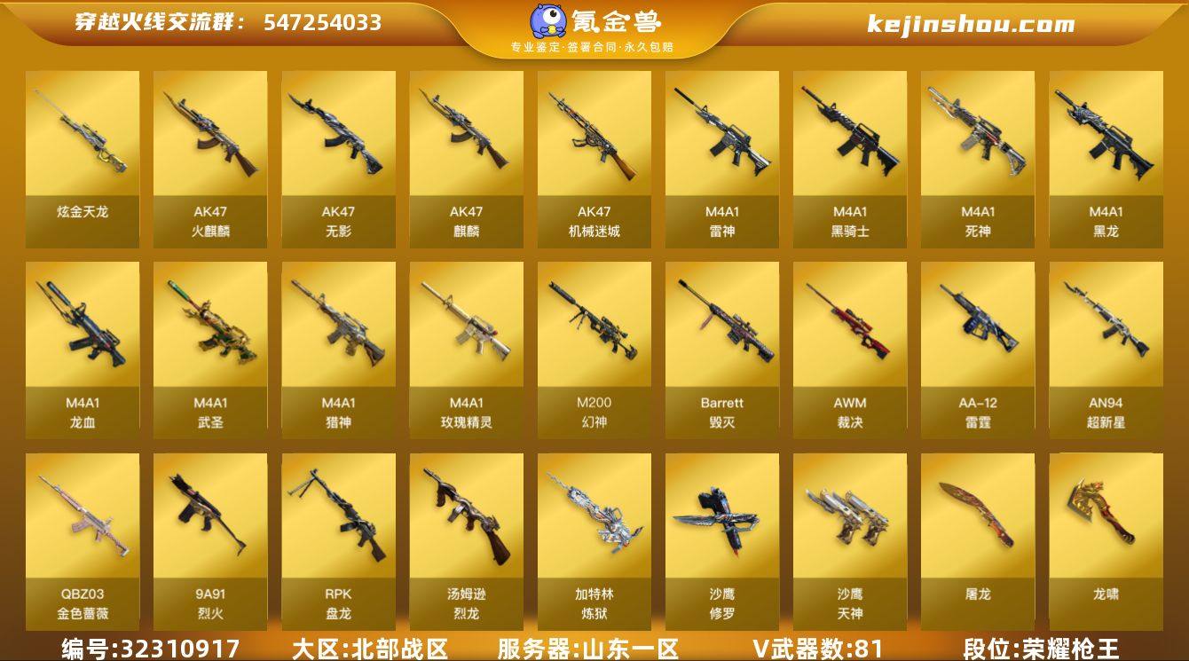 ★可协助解人脸★ 山东一区83V2王者1炫金可排位/M200幻神+尼泊尔-雷霆+1套雷霆雷/4把QBZ03-金色蔷薇/1盘龙2炼狱2烈龙+死亡之眼/5麒麟刺/黑骑士音效卡/毁灭音效卡/火麒麟CFS2018/黑骑士战神马超/雷神海滩派对/天龙传奇白鲨/天龙传奇70KG/火麒麟AG战队/毁灭冠军之怒/火麒麟冠军之心/修罗冠军之魂/毁灭荣耀之怒/雷神-白鲨-CFPLS14冠军/炼狱星空/激光毁灭者3/乱世超越4/王者之魄觉醒/炫金天龙/武圣/4毁灭/2屠龙/迷迭香/奇洋探员/王者零/魅影/战舰头盔/战舰护目镜/炫彩背包/超级背包3-7/永久防弹衣+永久防弹头盔+永久C4工具钳+永久手雷包/28赛季枪王4/详情看图★星迈游★低价出售找回包赔