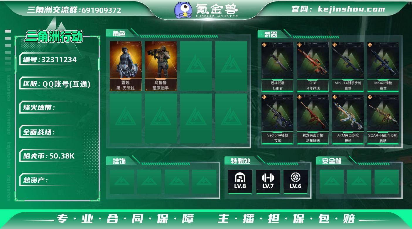 【sjs9130】7m总资产-535k哈伏币-60烽火等级-钻石-1战场等级-无军衔 【干员外观】:蛊-能天使午夜邮差,红狼-电锯惊魂 【近战皮肤】:近战-暗星,近战-黑鹰 【传说外观】:M4A1突击步枪-阿米娅,AKM突击步枪-锦绣,SCAR-H战斗步枪-启航,CAR-15突击步枪-阿米娅,腾龙突击步枪-捞点薯条,K437突击步枪-锦绣,MK47突击步枪-暗星,Vector冲锋枪-能天使-午夜邮差,SMG-45冲锋枪-锦绣,SR-3M紧凑突击步枪-暗星,勇士冲锋枪-能天使-午夜邮差,PKM通用机枪-荼蘼,M14射手步枪-缄花,SR-25射手步枪-缄花,AWM狙击步枪-捞点薯条,.357左轮-缄花,93R-捞点薯条 【史诗外观】:QBZ95-1突击步枪-曙光,K416突击步枪-阿萨拉特攻,AUG突击步枪-蝮蛇,SCAR-H战斗步枪-囚徒,MP5冲锋枪-深海恐惧,P90冲锋枪-紧急戒备,SMG-45冲锋枪-阿萨拉特攻,SR-3M紧凑突击步枪-战术竞备,勇士冲锋枪-工业狂潮,MP7冲锋枪-六套之力,QJB201轻机枪-炽焰,QJB201轻机枪-Old Habits,SV-98狙击步枪-林中猎手,SV-98狙击步枪-猎鳄行动,沙漠之鹰-曙光 【稀有外观】:QBZ95-1突击步枪-公平竞技,M7战斗步枪-捣蛋鬼,SG552突击步枪-贴花艺术,SCAR-H战斗步枪-荣耀列队,MP5冲锋枪-弄臣,MP5冲锋枪-哈夫克卫队,Vector冲锋枪-先锋,SMG-45冲锋枪-行动开启,M1014霰弹枪-幻影结构,QJB201轻机枪-哈夫克卫队,Mini-14射手步枪-荣耀列队,SR-25射手步枪-开拓,SR-9射手步枪-街头涂鸦,SV-98狙击步枪-星链科技,SV-98狙击步枪-哈夫克航天,SV-98狙击步枪-精英联盟,QSZ92G-一帆风顺,G18-星链科技,G18-哈夫克航天 【普通外观】:M4A1突击步枪-粉色涂装,M4A1突击步枪-高雅黑,M4A1突击步枪-海色,QBZ95-1突击步枪-高雅黑,QBZ95-1突击步枪-海浪,QBZ95-1突击步枪-2026,M16A4突击步枪-山林猎人,M16A4突击步枪-高雅黑,AUG突击步枪-浅蓝涂装,M7战斗步枪-...
