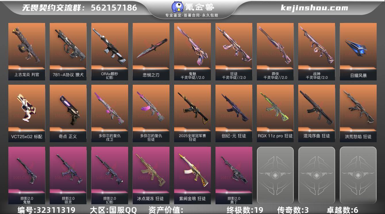 【PTWW3000】终极*19/传奇*3/卓越*6/皮肤*62/等级*60/段位:黄金/无畏契约季前邀请赛套装/千灵华绽//2.0 套装/掠影2.0套装/幻棱/炼狱/暮蝶/壹决/铁臂/捷风/雷兹/幽影/不死鸟/贤者/猎枭/零/芮娜/尚勃勒/霓虹/斯凯/夜露/K/O/盖可/黑梦/近战武器-碎心裂刃/无畏契约季前邀请赛 悲悯之刃/流风回雪/影钩/黑波之刃/日耀风暴/2025全球冠军赛 狂徒/狂徒-洪荒怒焰/狂徒-混沌序曲/狂徒-创·纪元/狂徒-RGX 11z pro/多弥尔的复仇 狂徒/狂徒-千灵华绽//2.0/狂徒-冰点凝冻/狂徒-紫阙金琅/幻影-ORAx颗秒/幻影-掠影2.0/多弥尔的复仇 戍卫/獠犬-781-A协议/莽侠-千灵华绽//2.0/战神-千灵华绽//2.0/奥丁-掠影2.0/判官-上古龙炎/骇灵-掠影2.0/标配-VCT25xG2/正义-奇点/鬼魅-千灵华绽//2.0/鬼魅-掠影2.0/欢迎来到底城 卡面/南瓜盛典 卡面/树懒大作战 卡面/无畏契约GO!第一卷:芮娜 卡面/无畏契约GO!第一卷:零 卡面/无垠星环 卡面/《双城之战》金克丝 卡面/钢锁vs盖可 卡面/代号红色 卡面/新兵报到 卡面/V契约 卡面/无畏契约 卡面/都算到了 喷漆/VCT x G2 喷漆/买装还是存钱 喷漆/红鳞 喷漆/松叶 喷漆/放下武器 喷漆/胜利属于无畏契约 喷漆/GLHF 喷漆/无畏契约 喷漆/无畏契约GO!第一卷 芮娜 挂饰/动...