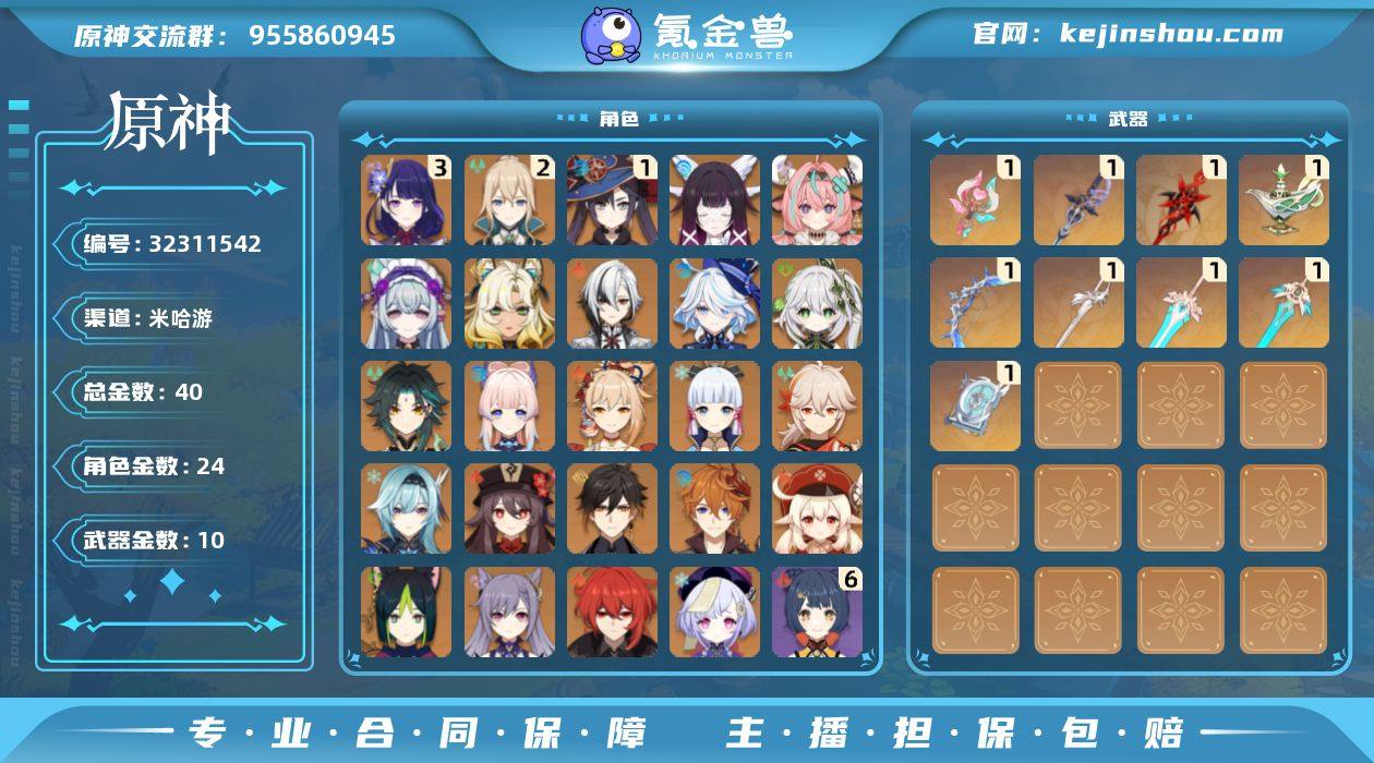邮箱: 不送邮/死邮 总黄数: 40 冒险等级: 60 3命金色角色: 三命雷电将军 2命金色角色: 二命琴 1命金色角色: 一命莫娜 0命金色角色: 迪卢克,枫原万叶,优菈,神里绫华,宵宫,可莉,七七,刻晴,达达利亚,钟离,魈,胡桃,珊瑚宫心海,提纳里,纳西妲,芙宁娜,阿蕾奇诺,希诺宁,梦见月瑞希,瓦雷莎,哥伦比娅 拥有武器: 四风原典,天空之傲,风鹰剑,天空之刃,冬极白星,千夜浮梦,赤月之形,赦罪,溢彩心念 1精武器: 四风原典,天空之傲,风鹰剑,天空之刃,冬极白星,千夜浮梦,赤月之形,赦罪,溢彩心念