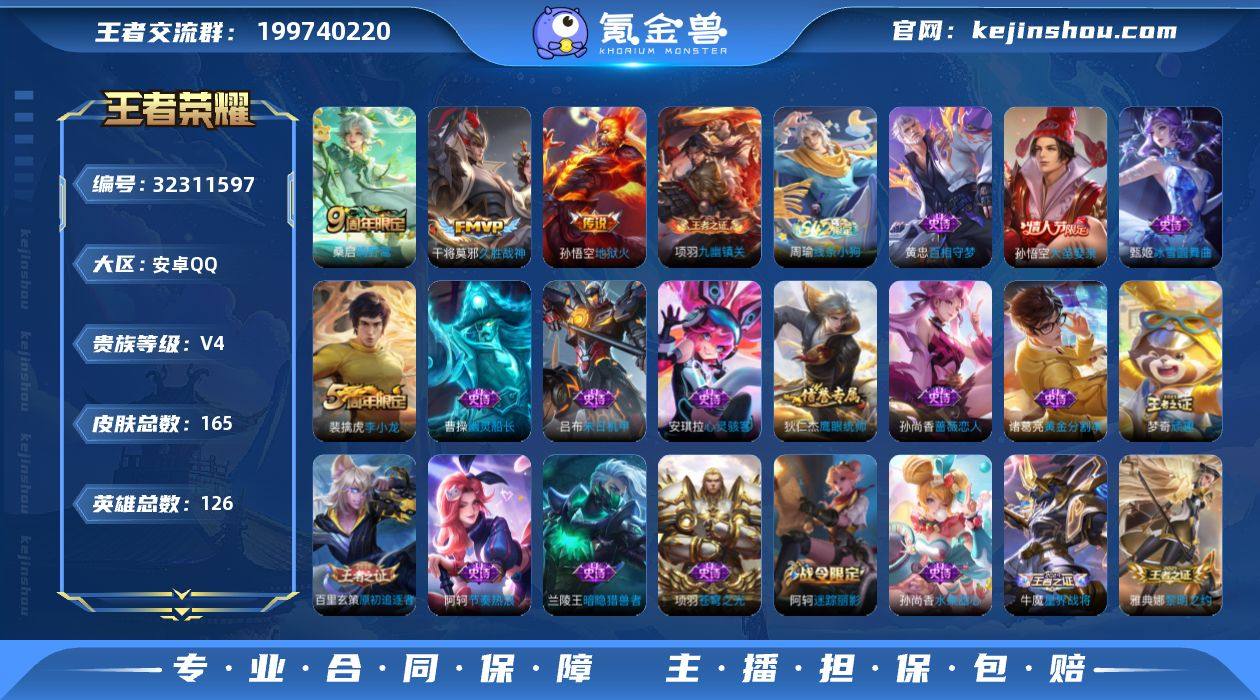 安卓Q-V4-永恒钻石IV段位-127英雄-184皮肤-9传说-48史诗【传说皮肤】:后羿神树通天,云缨幻光神枪,桑启鸣野蒿,孙尚香音你闪耀,后羿无尽星芒,马超无双飞将,孙尚香异界灵契,貂蝉猫影幻舞,孙悟空地狱火【限定皮肤】:白起狰,蔡文姬夏日便利店,虞姬夏日便利店,姜子牙天穹之誓,杨戬破阵退雄兵,狄仁杰阴阳师,赵云皇家上将,墨子神迹守卫,孙尚香蔷薇恋人,孙尚香异界灵契,鲁班七号乒乒小将,高渐离死亡摇滚,元歌无心,曹操烛龙,典韦穷奇,狄仁杰魔术师,达摩沙漠行僧,项羽海滩派对,老夫子航海奇遇记,程咬金演武夺筹,兰陵王金庭之子,孙悟空至尊宝,孙悟空孙行者,后羿圣弓游侠,后羿无尽星芒,李元芳云中旅人,钟馗驱傩正仪,干将莫邪真爱魔法,太乙真人饕餮,鬼谷子五谷丰年,苏烈千军破阵,沈梦溪大漠名商,裴擒虎擒涛扼浪,米莱狄御霄,伽罗天狼溯光者,嫦娥拒霜思,鲁班大师探海日志,桑启海盐诗旅,艾琳女武神,张良古海寻踪,高渐离燃音魔法,妲己灵卜魔法,鬼谷子天穹祈灯,沈梦溪龙舞盛年,刘邦剑破天穹,刘备异域游侠,周瑜熔金海岸【赛季限定】:白起狰,曹操烛龙,典韦穷奇,达摩沙漠行僧,程咬金演武夺筹,兰陵王金庭之子,张良古海寻踪,李元芳云中旅人,钟馗驱傩正仪,太乙真人饕餮,苏烈千军破阵,沈梦溪大漠名商,裴擒虎擒涛扼浪,米莱狄御霄,鲁班大师探海日志,桑启海盐诗旅,鬼谷子天穹祈灯,刘邦剑破天穹,姜子牙天穹之誓【战令限定】:墨子神迹守卫,蔡文姬夏日便利店,虞姬夏日便利店,老夫子航海奇遇记,后羿圣弓游侠,干将莫邪真爱魔法,高渐离燃音魔法,妲己灵卜魔法【史诗皮肤】:项羽苍穹之光,赵云皇家上将,赵云未来纪元,貂蝉圣诞恋歌,甄姬冰雪圆舞曲,狄仁杰魔术师,宫本武藏鬼剑武藏,孙尚香蔷薇恋人,孙尚香水果甜心,嬴政摇滚巨星,妲己魅力维加斯,妲己女仆咖...