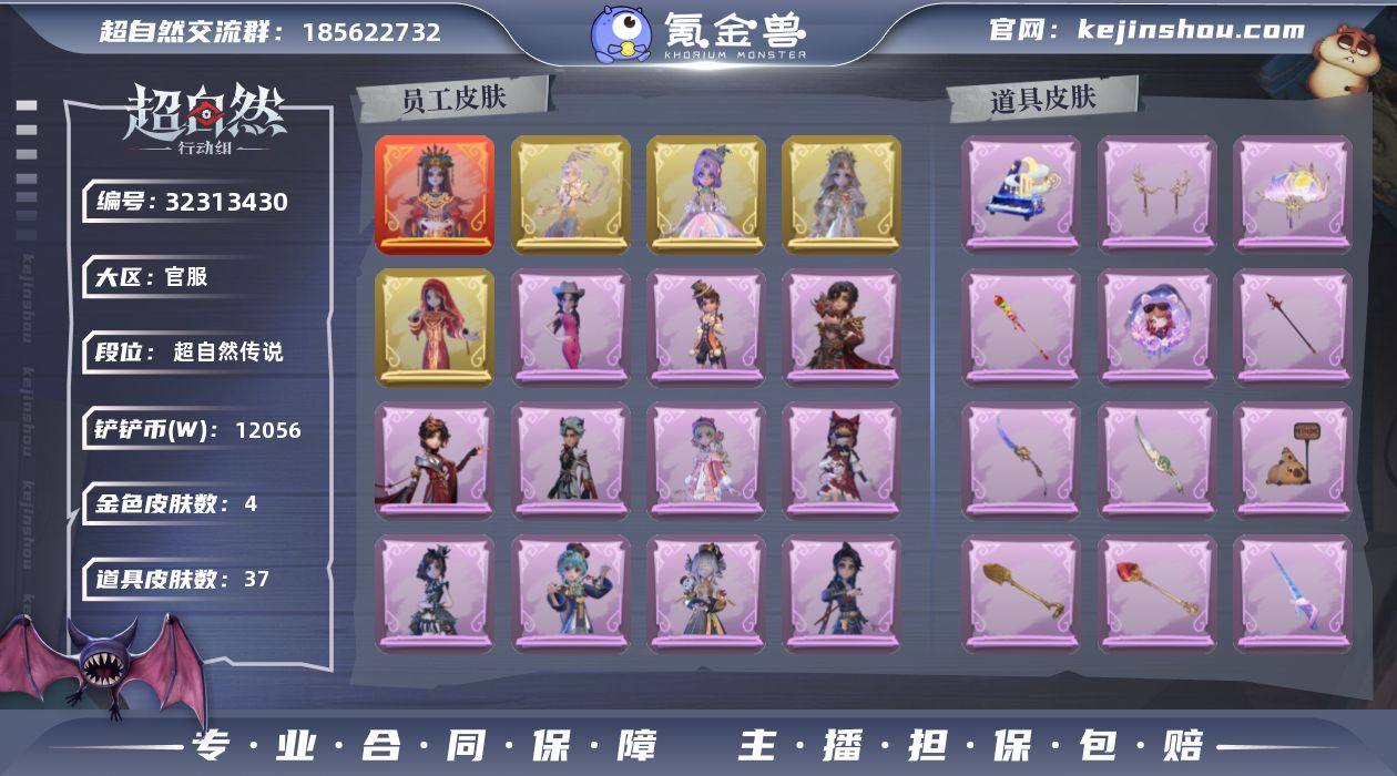 DJ370⭐段位】超自然传说 【幻梦皮肤数量】0 【金色皮肤数量】3 【紫色皮肤数量】5 【道具皮肤数量】16 【铲铲币】58w 【赛季魔盒】稀世豪华魔盒 【员工】小黄、爱丽丝、零、阿念、逍遥、薇薇安、巫铃儿、莉莉、艾伦、爱德华 【金色皮肤】薇薇安-圣光之谕、小黄-遗失的童话、巫铃儿-镜花辞 【紫色皮肤】阿念-王子与骑士、莉莉-情公主、爱丽丝-丝缕哀歌、逍遥-绣春逍影、小黄-呱呱雨衣 【道具皮肤】除颤仪-弦外之音、电击枪-甜蜜泡泡枪、刺刀-紫气东来、音响-鸣沙鼓、黄牛能量饮料-青玉抱丹、刺刀-碧络琅环、长鞭-小狗蛇点点鞭、音响-happy猫、转轮手枪-新星时代、急救包-蔷薇物语、长鞭-飞天绫、腰包-月下莲台、短管猎枪-星光的裁决、铲子-圣心之泪、摸金符-紫霄、传送按钮-昆仑镜 【头饰】小财神豚豚头套、鱼头怪头套、烈焰红唇头套、大葱明头套、火爆了头套、面具马头套、哈士奇头套、萨卡班甲鱼头套、嘻嘻头套、滑稽头套、呆滞头套、卑微头套、小狗蛇点点头套、炙热烧烤、像素朋克墨镜、后室幸存者头套 【背饰】天使的呼唤、蝶恋花、毛球夹子、绒团小狐狸 【挂饰】未竟乐园、小鲨包包、天使消失的年代、钗头凤 【动作】luvaboy、伤心摇、舞台中心、律动迪斯科、举牌、抬手、KT猫摇