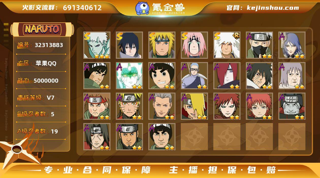 实名: 可修改 贵族等级: V7 S忍数: 5 A忍数: 19 战力值(万): 500 S级忍者: 波风水门,自来也 「舞之豪杰」,春野樱 「忍界大战」,宇智波佐助「永恒万花筒」,宇智波带土「十尾人柱力」
