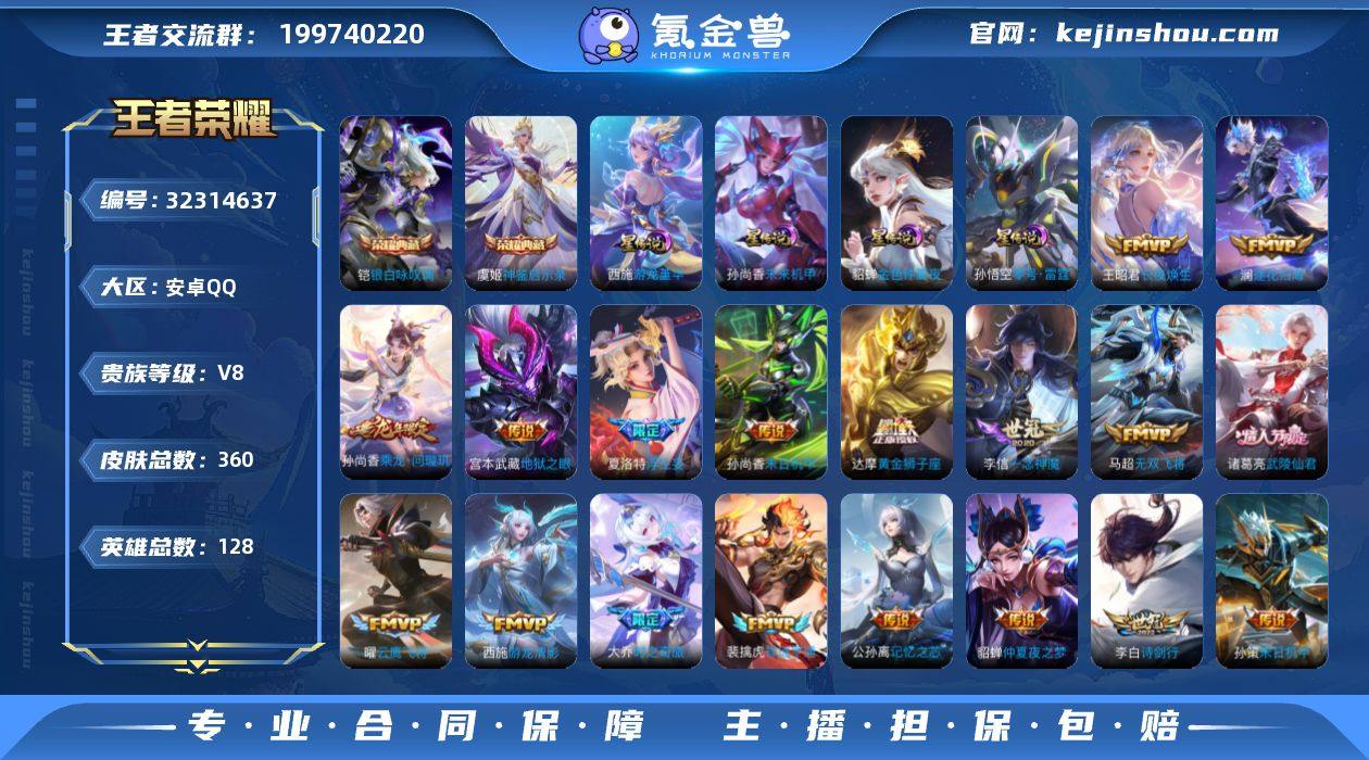 安卓Q-V8-最强王者段位-128英雄-360皮肤-2典藏皮肤-30传说-99史诗 【英雄全皮】:孙权全皮,敖隐全皮,海月全皮,夏洛特全皮,空空儿全皮,影全皮,海诺全皮 【荣耀典藏】:铠银白咏叹调,虞姬神鉴启示录 【传说皮肤】:王昭君长夜焕生,裴擒虎祥瑞亨通,海月金乌负日,孙尚香乘龙问璇玑,铠琥珀纪元,澜逐花归海,大乔时之奇旅,马可波罗妄想实况,公孙离记忆之芯,夏洛特浮生妄,李白诗剑行,狄仁杰神器狴犴令,百里守约碎云,马超无双飞将,孙策挚爱之约,孙策末日机甲,王昭君乞巧织情,西施游龙清影,铠绛天战甲,虞姬启明星使,孙悟空零号赤焰,曜云鹰飞将,李信一念神魔,刘备时之恋人,达摩黄金狮子座,后羿黄金射手座,诸葛亮武陵仙君,貂蝉仲夏夜之梦,孙尚香末日机甲,宫本武藏地狱之眼 【限定皮肤】:虞姬夏日便利店,狄仁杰阴阳师,赵云皇家上将,赵云百木心枪,墨子神迹守卫,妲己时之奇旅,孙尚香蔷薇恋人,鲁班七号狮舞东方,庄周高山流水,高渐离玩趣恶龙,阿轲迷踪丽影,钟无艳超时空战士,扁鹊奇幻香踪,白起夜都怪侠,芈月幻夜卜梦,吕布猎兽之王,吕布御风骁将,元歌云间偶戏,元歌无心,夏侯惇朔风刀,夏侯惇匿光决锋者,甄姬游园惊梦,甄姬落雪兰心,...
