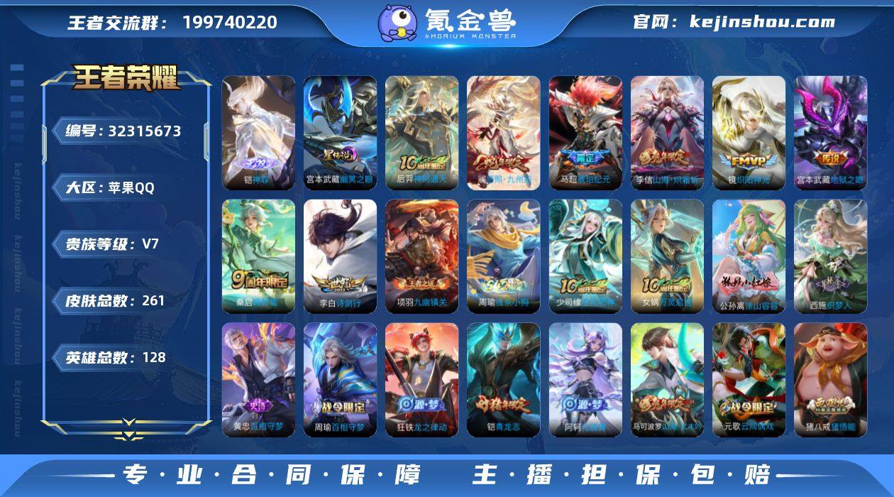【WZ181330】苹果Q-至尊星耀II段位-128英雄-261皮肤-1无双-8传说-56史诗【英雄全皮】:孙权全皮【无双皮肤】:铠神罪【传说皮肤】:后羿神树通天,澜愿照九州拓,桑启鸣野蒿,马超琥珀纪元,李信山海炽霜斩,李白诗剑行,镜炽阳神光,宫本武藏地狱之眼【限定皮肤】:大乔绒语心约,姜子牙天穹之誓,狄仁杰阴阳师,赵云皇家上将,庄周高山流水,高渐离玩趣恶龙,元歌云间偶戏,元歌无心,马可波罗山海玄木吟,狄仁杰魔术师,达摩沙漠行僧,项羽海滩派对,程咬金演武夺筹,兰陵王金庭之子,李元芳云中旅人,钟馗驱傩正仪,女娲朔望之晖,干将莫邪胡桃夹子,鬼谷子原初探秘者,鬼谷子五谷丰年,铠青龙志,沈梦溪大漠名商,裴擒虎李小龙,裴擒虎擒涛扼浪,李信山海炽霜斩,猪八戒猪悟能,嫦娥拒霜思,嫦娥暖冬兔眠,西施玲珑珍味,鲁班大师探海日志,桑启海盐诗旅,暃星界游侠,阿古朵江河有灵,张良古海寻踪,鬼谷子天穹祈灯,马超琥珀纪元,沈梦溪龙舞盛年,鲁班七号蔬乡物语,李元芳蔬乡物语,刘邦剑破天穹,程咬金群星魔术团,镜青焰无极,项羽苍威无极,刘备异域游侠,周瑜熔金海岸【年限皮肤】:铠青龙志,李信山海炽霜斩,马可波罗山海玄木吟,澜愿照九州拓【赛季限定】:...