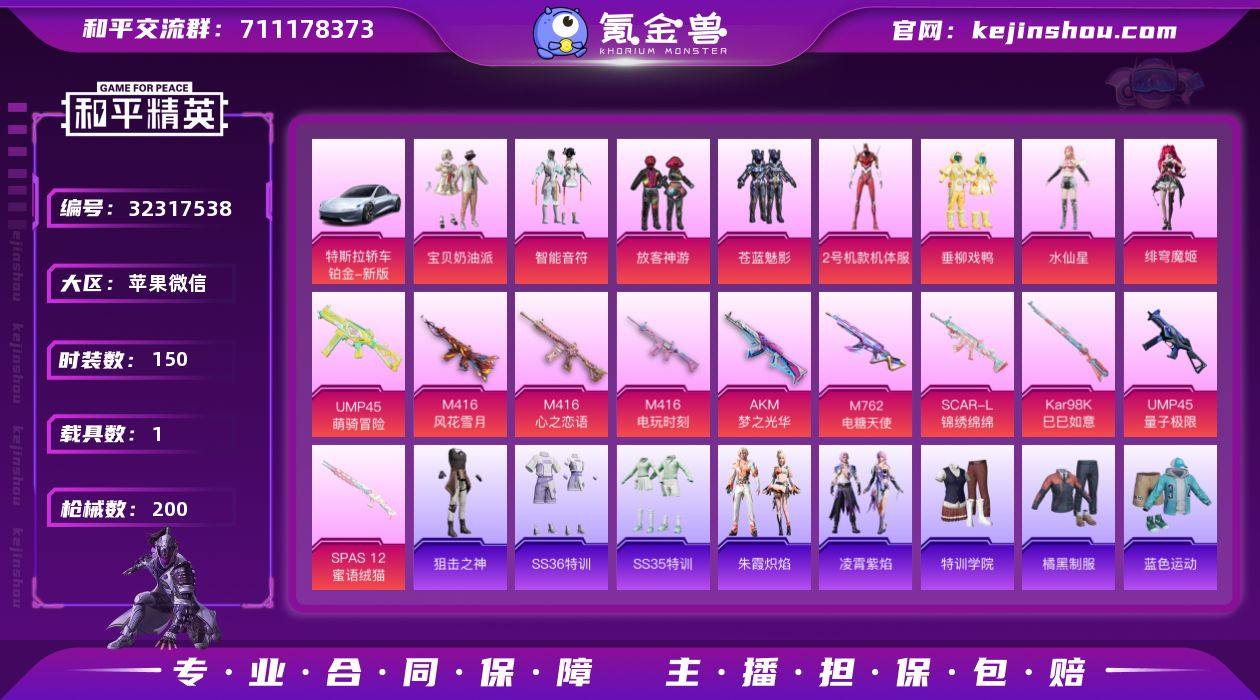【1载具 10特效枪 9粉装 200枪皮 150套装】14王牌1卓越 热力值6.9w 红螳螂 暗影哥特,小丑鱼,宝贝奶油派,梦幻火箭,放客神游,苍蓝魅影 2号机款机体服,垂柳戏鸭,水仙星,特斯拉Roadster(尊享铂) M416-风花雪月7级 M416-心之恋语,M416-电玩时刻,AKM-梦之光华,M762-电糖天使,SCAR-L-锦绣绵绵,Kar98K-巳巳如意,UMP45-萌骑冒险,UMP45-量子极限,SPAS-12-蜜语绒猫 龙翔九天飞行器,庄周梦蝶飞行器,风花雪月飞行器,鸿潮鸣舰飞行器,编号:QNDEF32