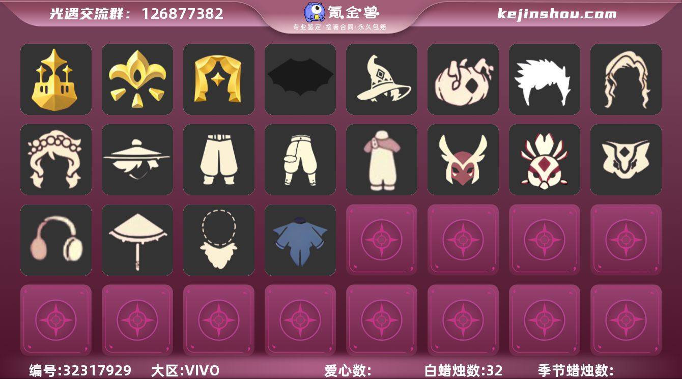 蜡烛数:32/爱心数:55/云野/雨林/霞谷/墓土/禁阁/梦想季/集结季/表演季/阿努比斯(狗头)/凤凰面具/凤凰斗篷/胜利号角/连帽斗篷/小王子发型/小王子套装/风行毛领/黄眉企鹅面具/燕尾斗篷/巫师/巫树犄角/南瓜/蝙蝠套/花憩茶桌/武士裤/背带裤/搓澡巾/虚荣/花环/红耳机/若笠/白金斗篷/黑金斗篷/红金斗篷/雨伞/黄鼠狼/猫猫头/花环长发/帝企鹅发/多羽发饰/玉兔发饰/创始人斗篷/情人跷跷板/情人秋千