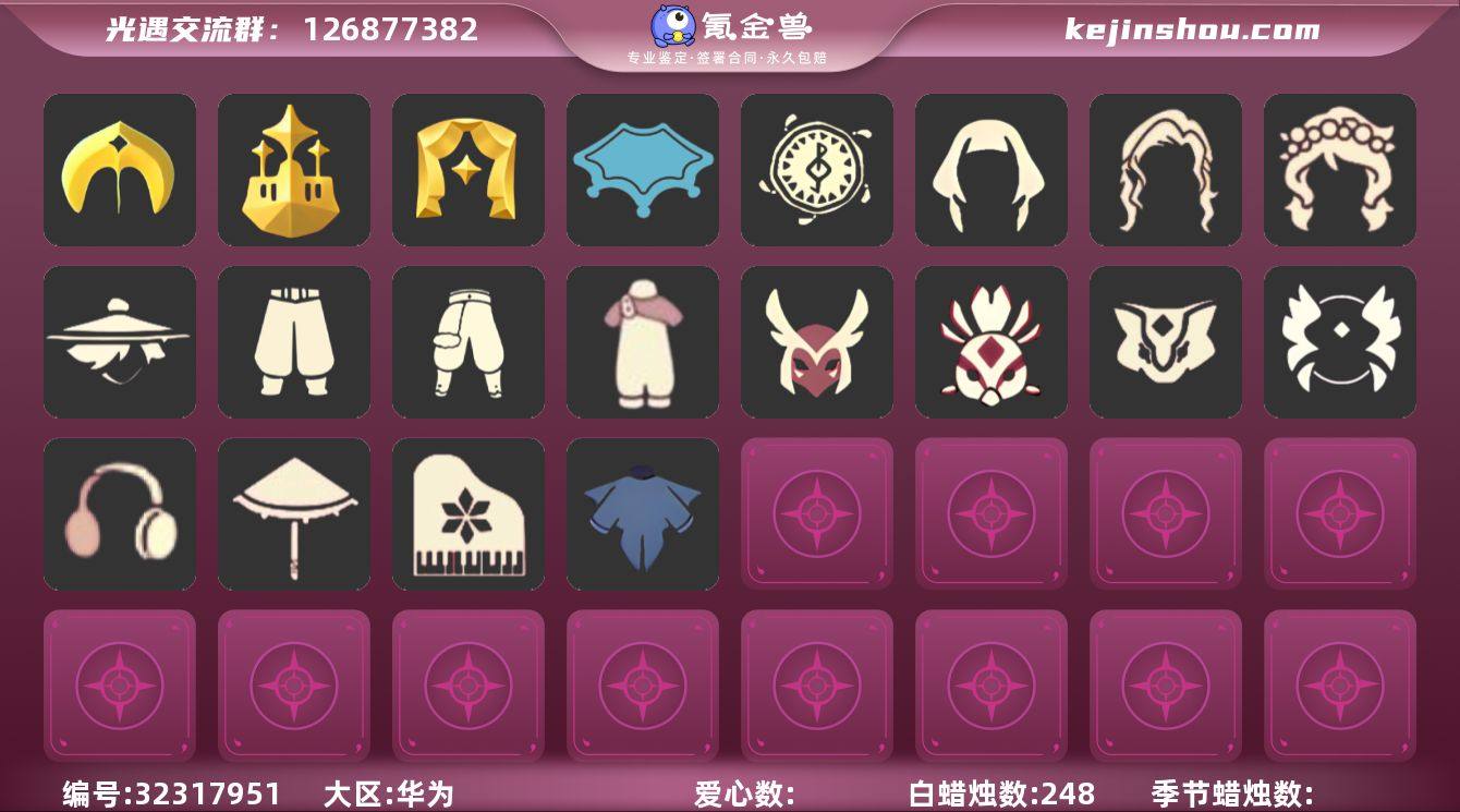 蜡烛数:248/爱心数:24/云野/雨林/霞谷/墓土/禁阁/圣岛季/梦想季/表演季/手碟/鳐鲲斗篷/阿努比斯(狗头)/凤凰面具/凤凰斗篷/单边小辫/黄眉企鹅面具/燕尾斗篷/留辫蘑菇头/九色鹿丸子头/九色鹿丝带裤/青鸟毕业面饰/圣诞鹿角/瑞雪/白雪斗篷/欧若拉之声/武士裤/背带裤/搓澡巾/虚荣/花环/红耳机/若笠/白金斗篷/黑金斗篷/红金斗篷/雨伞/高音钢琴/黄鼠狼/猫猫头/花环长发/帝企鹅发/贝壳发饰/玉兔发饰/小王子围巾/雪花水晶球/毕业手碟/瑞气纸伞