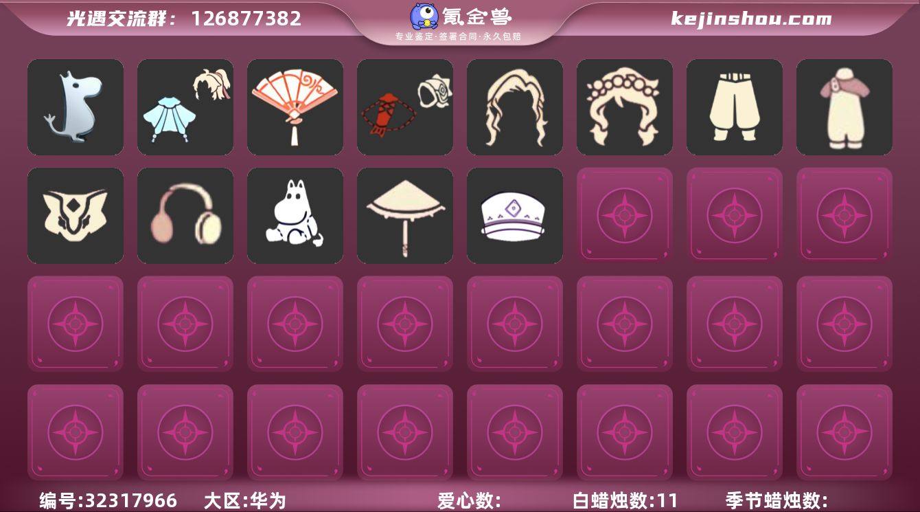蜡烛数:11/云野/雨林/霞谷/墓土/禁阁/姆明季/追忆之书/九色鹿丸子头/九色鹿丝带裤/姆明大伞/姆明抱枕/鲤鱼套/青衫落拓礼包/献瑞折扇礼包/武士裤/背带裤/虚荣/花环/红耳机/平顶帽/白金斗篷/黑金斗篷/雨伞/黄鼠狼/猫猫头/花环长发