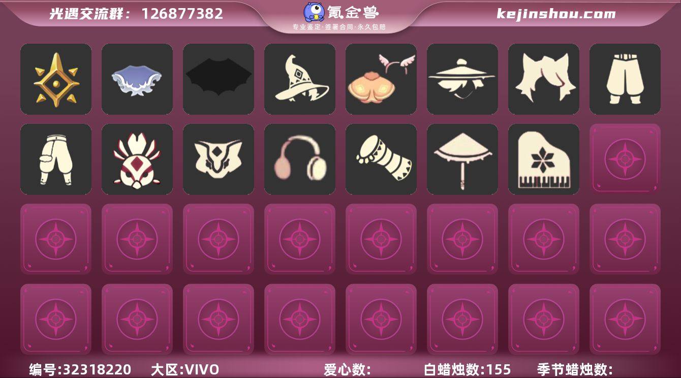 蜡烛数:155/爱心数:54/云野/雨林/霞谷/墓土/预言季/鳐鲲斗篷/阿努比斯(狗头)/圆鼓/凤凰面具/巫师/蝙蝠套/白雪斗篷/飞蛾套/暗陨斗篷礼包/武士裤/搓澡巾/红耳机/若笠/白金斗篷/黑金斗篷/红金斗篷/雨伞/高音钢琴/黄鼠狼/猫耳/雪花发夹/创始人斗篷/飞蛾斗篷/暗陨斗篷/雪花水晶球/情人秋千
