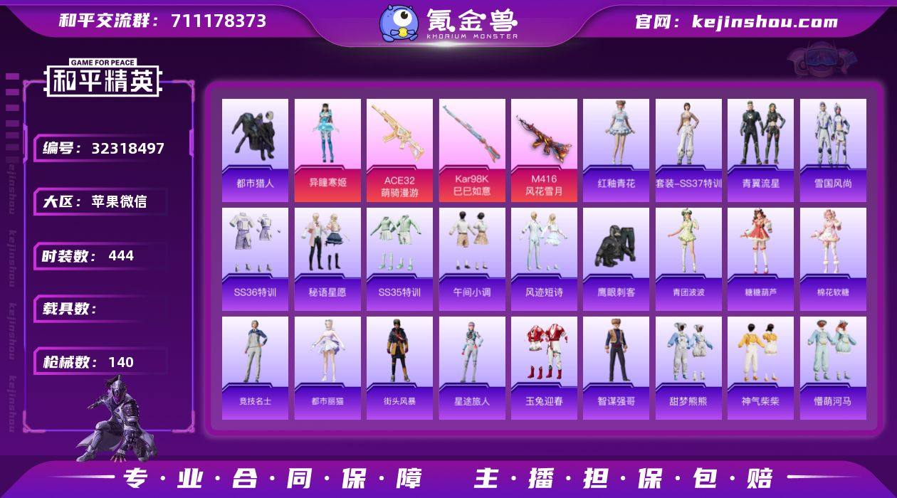 AL691457 【特价苹果v区微信临时社交 身法小号 都市猎人7级m4风花雪月 无敌战神框】 热力值44259 枪皮数量140 粉装数1 套装数量112 时装数444 战备数102 其他武器皮肤133 头盔51 动作41 伙伴4 其他武器皮肤:M762-绯红前夜,M762-天降萌叽,M762-瑞龙福将,M416-蓝色火焰,GROZA-彩虹符号,GROZA-影袭,GROZA-田园牧歌,GROZA-福马献瑞,GROZA-异彩先驱,GROZA-紫矿核心,GROZA-懵萌河马,蜜獾-糖糖葫芦,蜜獾-娇憨猪猪,蜜獾-天降萌叽,蜜獾-风迹短诗,ACE32-冰晶雪宝,AKM-萌趣颜团子,AKM-彩虹符号,AKM-虎虎生威,AKM-霓虹街区,AKM-影袭,AKM-夜灯,AKM-星之彼岸,AUG-青春冒险家,AUG-冰晶雪宝,AUG-耀粉歌者,SCAR-L-炫彩节奏,SCAR-L-玉兔迎春,SCAR-L-星途旅人,SCAR-L-红色方程式,AC-VAL-天降萌叽,AC-VAL-乌木金纹,Famas-乌木金纹,G36C-乌木金纹,G36C-懵萌河马,G36C-暗夜玫瑰,M16A4-雨过天青,M16A4-幻世战舞者,Mk47-乌木金纹,Mk47-风迹短诗,QBZ-彩虹符号,Win94-瑞龙福将,Mini14-乌木金纹,Kar98K-彩虹符号,Kar98K-乌木金纹,Kar98K-影袭,M200-乌木金纹,M200-惊鸿侠骨,莫辛纳甘-风迹短诗,莫辛纳甘-懵萌河马,莫辛纳甘-乌木金纹,AMR-雨过天青,M24...