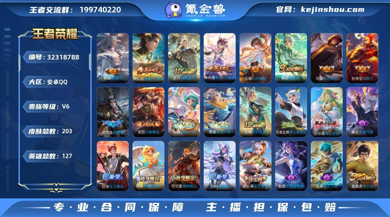 【5015】安卓Q-V6-最强王者段位-127英雄-203皮肤-8传说-58史诗 【传说皮肤】:韩信踏浪归,狄仁杰神骥赴朔漠,后羿神树通天,云缨幻光神枪,桑启鸣野蒿,孙尚香乘龙问璇玑,刘备时之恋人,孙悟空地狱火 【限定皮肤】:狄仁杰阴阳师,赵云皇家上将,扁鹊奇幻香踪,狄仁杰魔术师,项羽海滩派对,李元芳云中旅人,杨戬潮玩骑兵,沈梦溪星空之诺,裴擒虎李小龙,裴擒虎擒涛扼浪,云中君纤云弄巧,嫦娥拒霜思,鲁班大师探海日志,桑启海盐诗旅,艾琳流音漫舞,司空震地狱燃心,阿古朵江河有灵,张良古海寻踪,蒙犽百解令,高渐离燃音魔法,妲己灵卜魔法,鬼谷子天穹祈灯,姬小满妄想食味,孙尚香乘龙问璇玑,沈梦溪龙舞盛年,刘邦剑破天穹,程咬金群星魔术团,芈月浮光幕影,周瑜熔金海岸 【年限皮肤】:孙尚香乘龙问璇玑 【赛季限定】:李元芳云中旅人,桑启海盐诗旅,裴擒虎擒涛扼浪,鲁班大师探海日志,张良古海寻踪,鬼谷子天穹祈灯,刘邦剑破天穹,东皇太一噬灭天穹,太乙真人谧流熔炉,钟馗虚灵犬护,甄姬逆浪荇歌,亚瑟荣光之誓,项羽九幽镇关 【战令限定】:沈梦溪星空之诺,扁鹊奇幻香踪,杨戬潮玩骑兵,司空震地狱燃心,艾琳流音漫舞,高渐离燃音魔法,妲己灵卜魔法,亚...