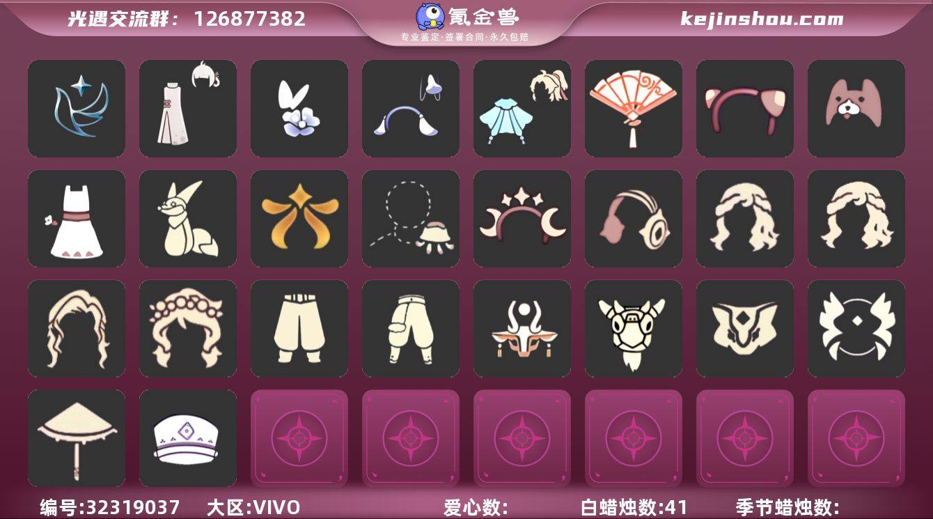 蜡烛数:41/爱心数:8/青鸟季/辉光羚羊面具/青鸟毕业面饰/青鸟斗篷/鹊桥相会套装/跃动跑鞋/水母/海蓝波浪发型/小狗周年发饰/粽子发饰礼包/星月头饰/蝴蝶与花发饰礼包/活力海牛礼包/彩虹耳机/欧若拉之翼/青衫落拓礼包/欧若拉之声/献瑞折扇礼包/小狐狸/武士裤/搓澡巾/虚荣/花环/平顶帽/白金斗篷/雨伞/向日葵连衣裙/黄鼠狼/羊头面具/星月头冠/水母肩饰/猫猫头/花环长发/玉兔发饰/蝴蝶与花发饰/小王子围巾